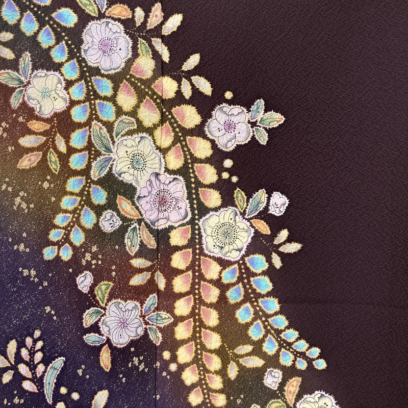 重厚感のある地色が、辻が花の繊細な色彩をより鮮やかに引き立て、歩くたびに息をのむほど優雅な佇まいを演出します。