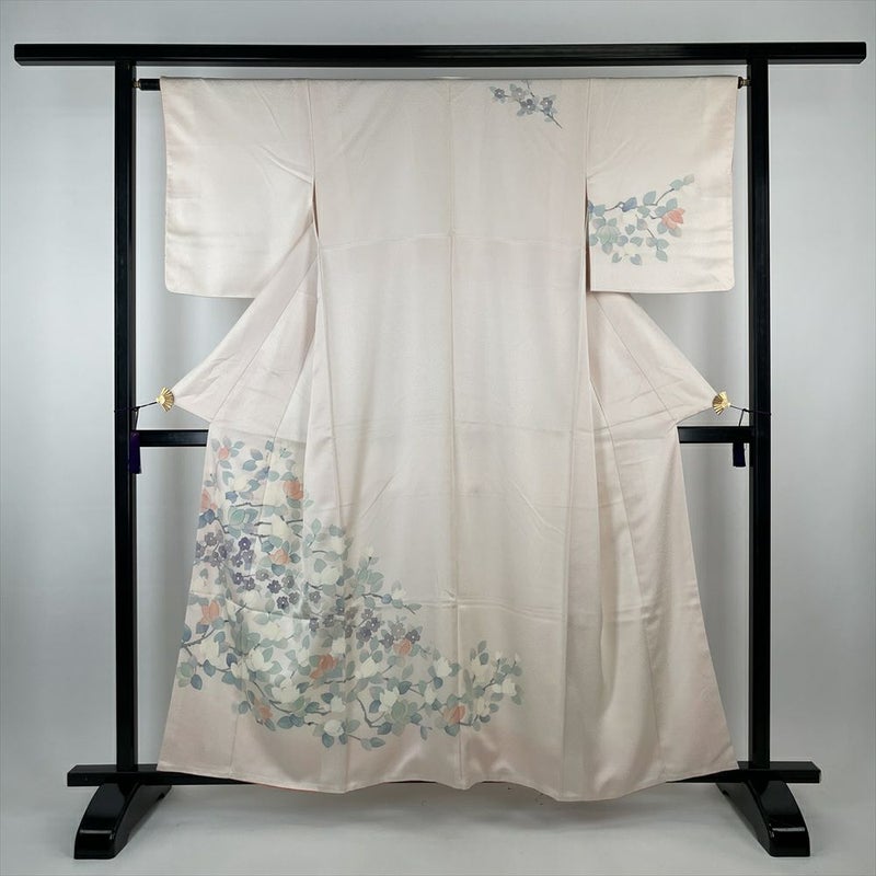 (中古) リユース着物 訪問着 薄ベージュ セミフォーマル 地紋織り 無線友禅 四季花 袷 未洗い SS【身丈】152cm 【裄丈】64cm MS819