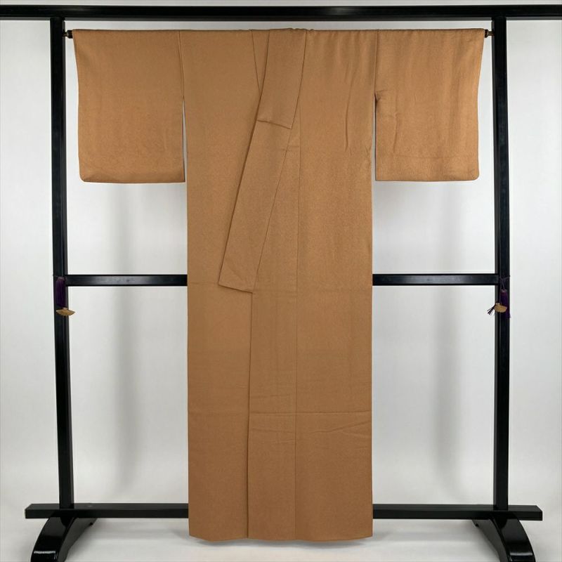 (中古) 色無地 薄茶色 薄オレンジ色 カジュアル 地紋織り 染め 袷 【身丈】157.5cm【裄丈】66cm