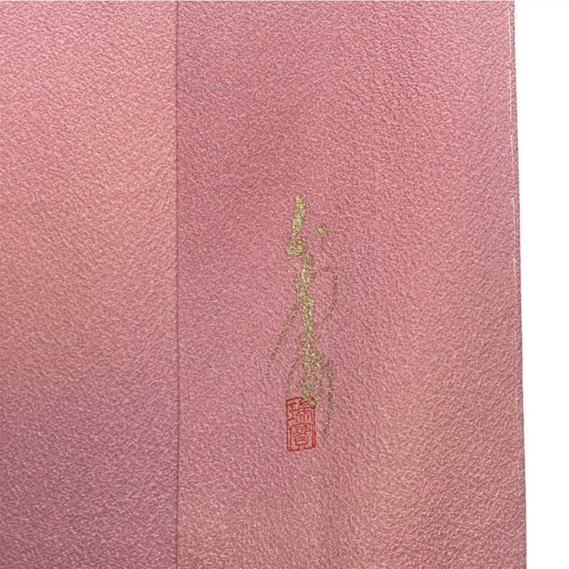 ピンクの地紋織りでたたき風にデザインされた色無地です。本草木染作家 瑞宝の落款があります 。背紋にシミ汚れがございます。保存臭がややございます。しつけがあります。