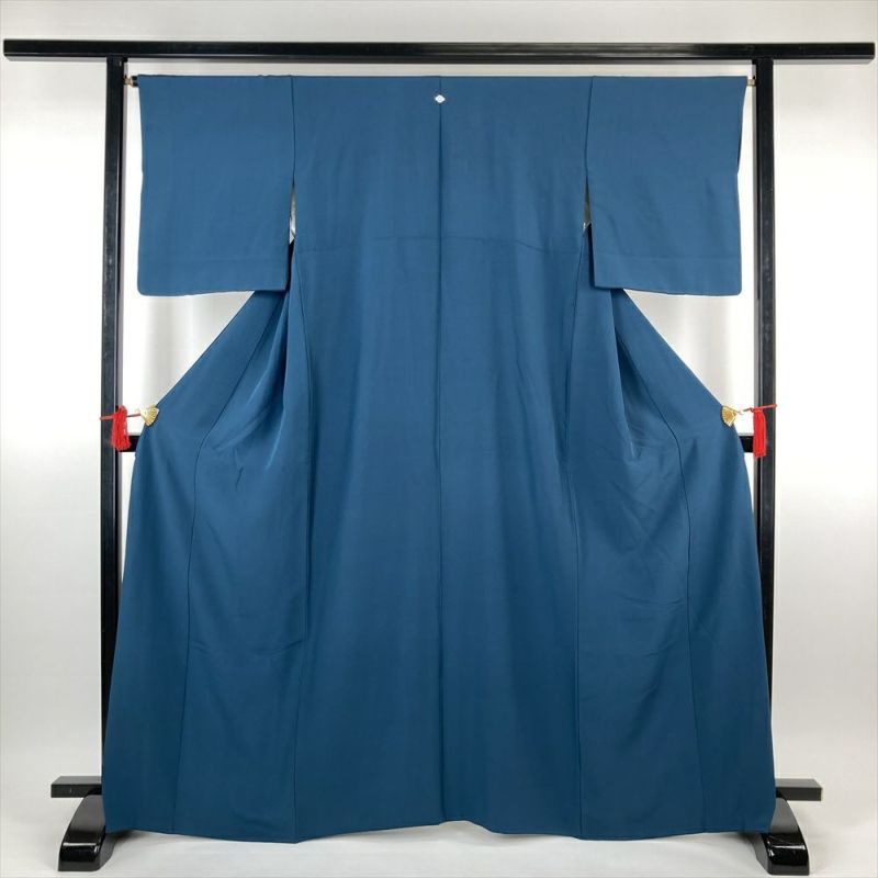 (中古)色無地 青 フォーマル セミフォーマル カジュアル ちりめん 一つ紋 袷 M【身丈】161.5cm【裄丈】66cm