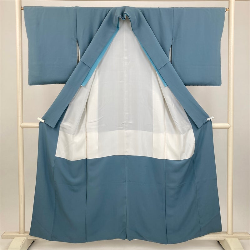 (中古) 色無地 ブルーグレー カジュアル セミフォーマル 縮緬 袷 絹【身丈】155cm【裄丈】66.5cm