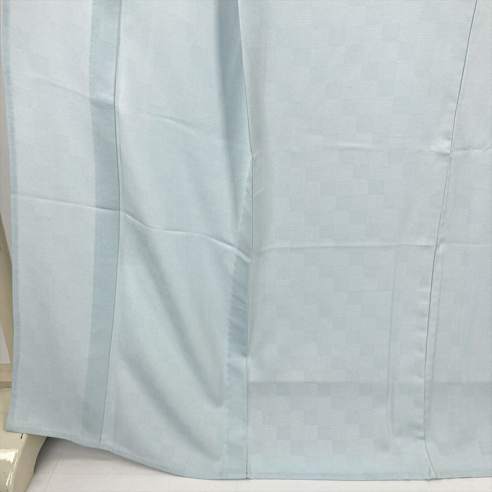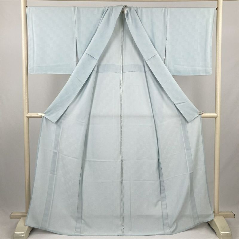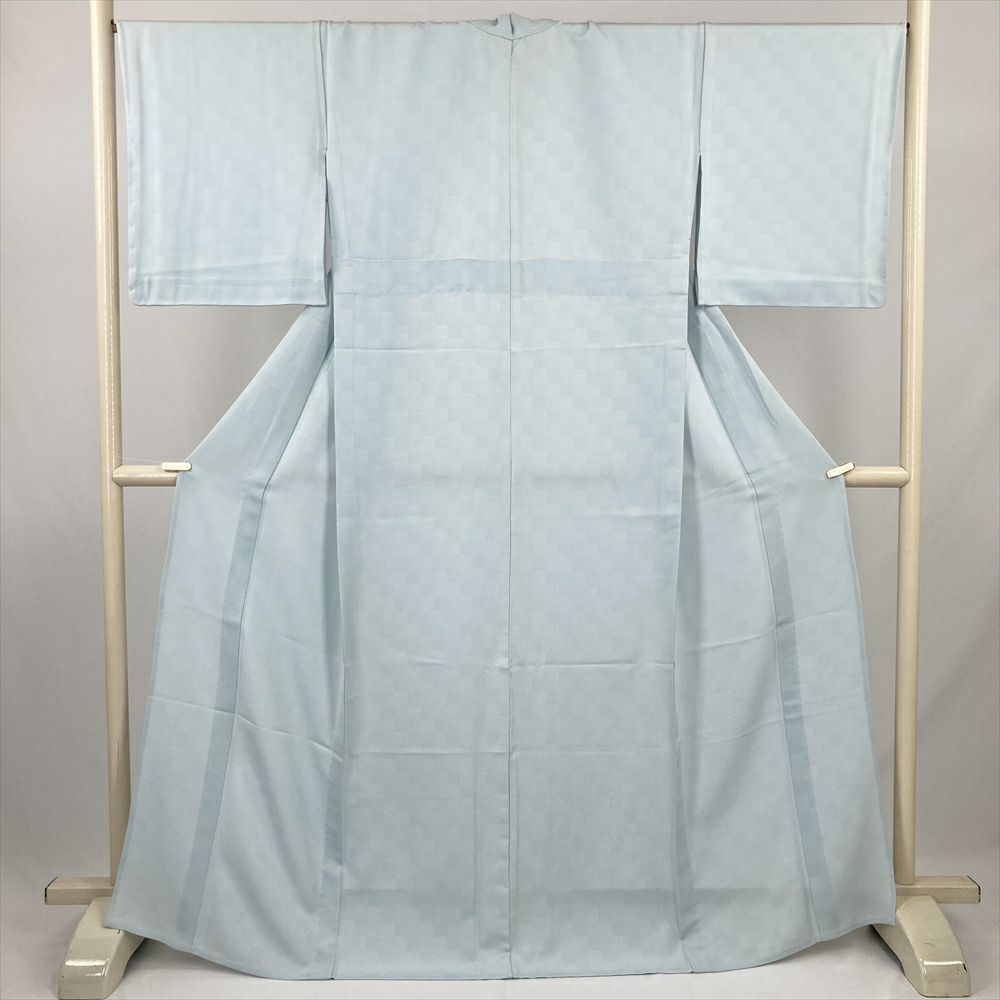 (中古) 小紋 水色 カジュアル 鮫 市松 単衣 絹 【身丈】164cm【裄丈】68.5cm