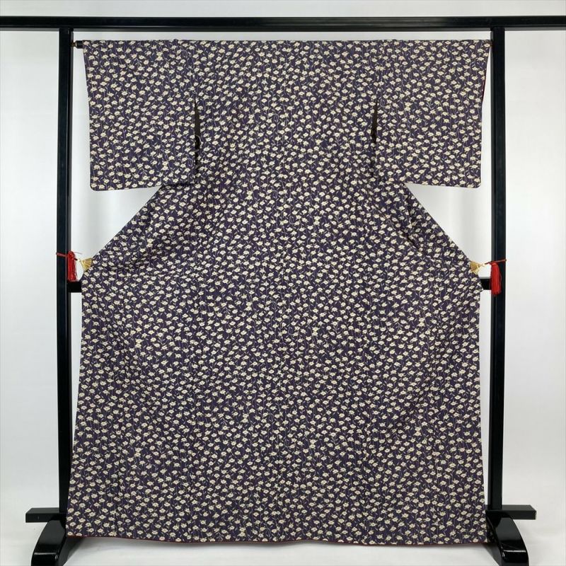 (中古)小紋 紫 ポリエステル ちりめん調 小花柄 袷 M【身丈】163cm 【裄丈】65.5cm