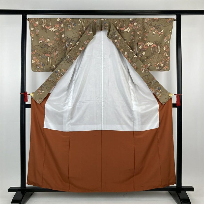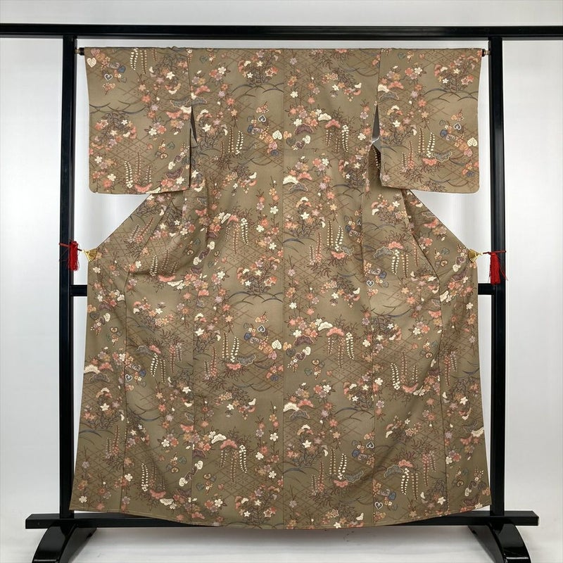 (中古)小紋 薄茶 ポリエステル 洗える ちりめん調 藤 竜胆 女郎花 桜 菱 袷 S【身丈】157.5cm 【裄丈】66cm