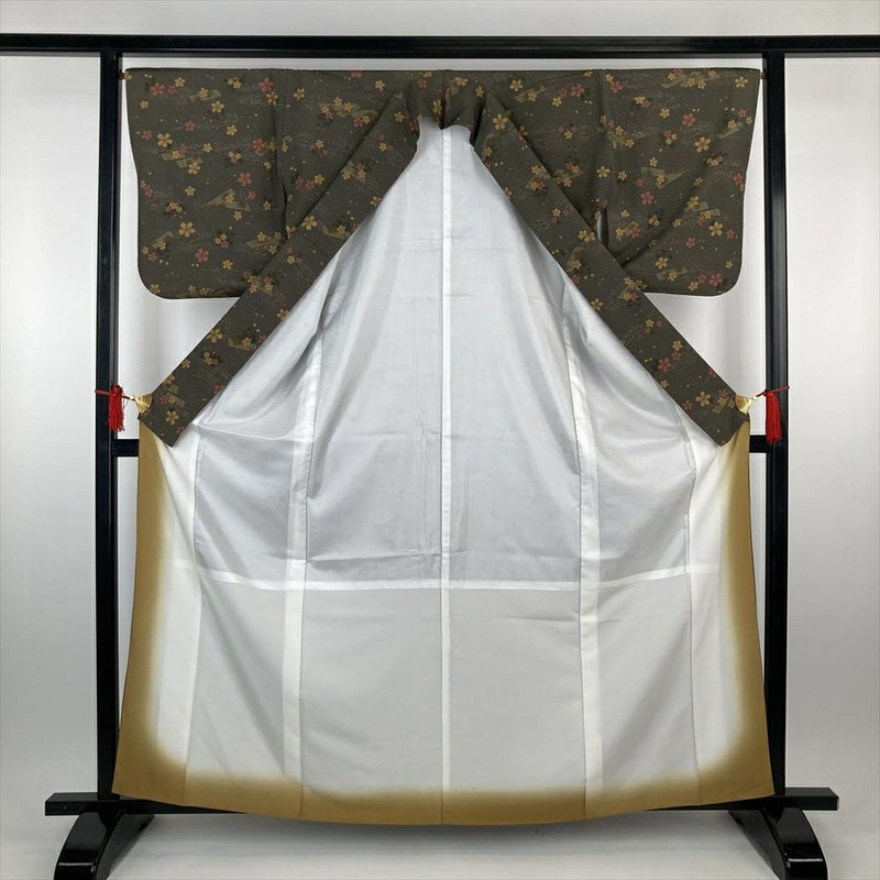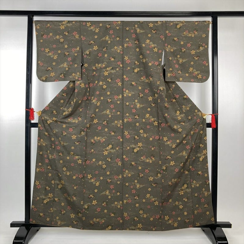 (中古)小紋 カーキグリーン ポリエステル 洗える ちりめん調 花筏 桜 流水 袷 S【身丈】159cm 【裄丈】66cm