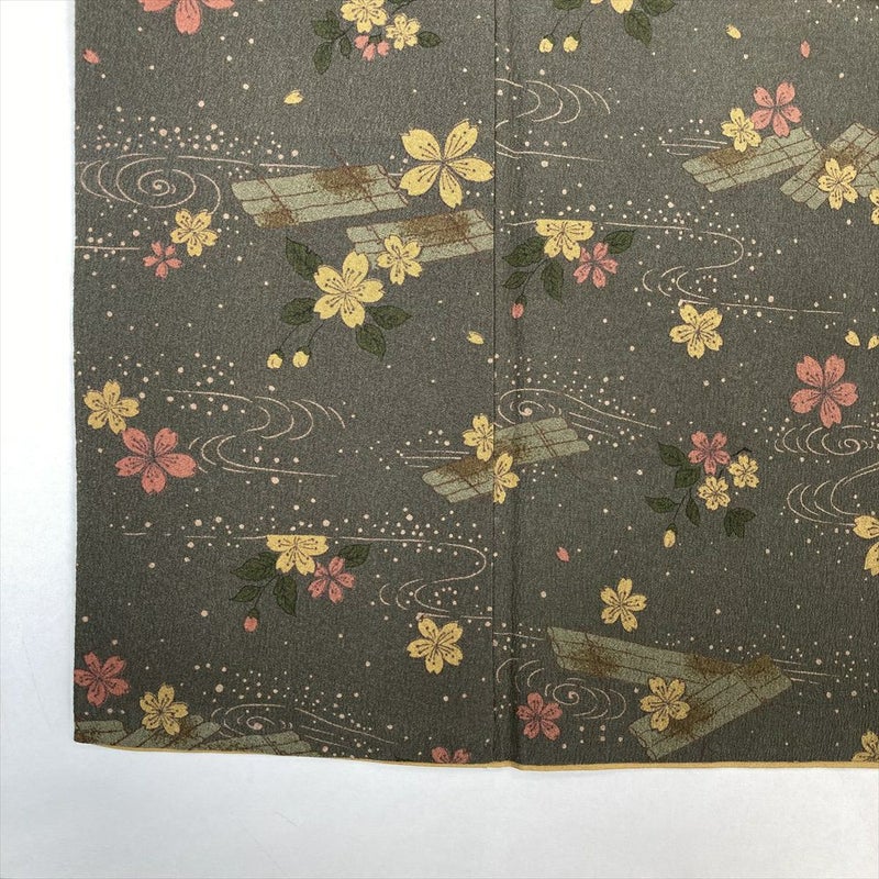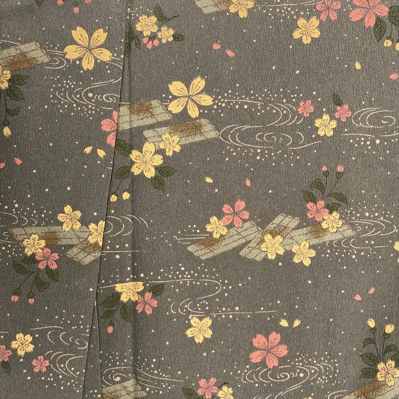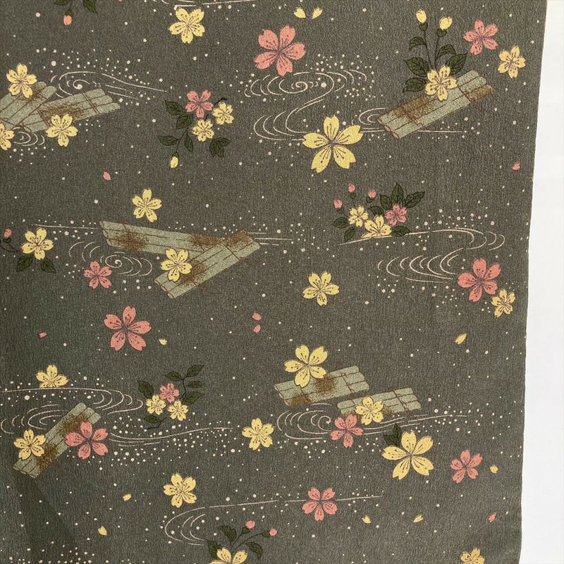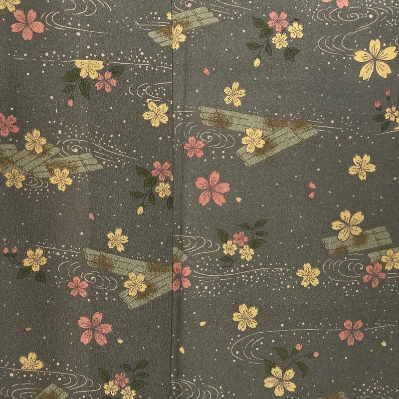 【色柄】カーキグリーン ちりめん調 花筏 桜 流水