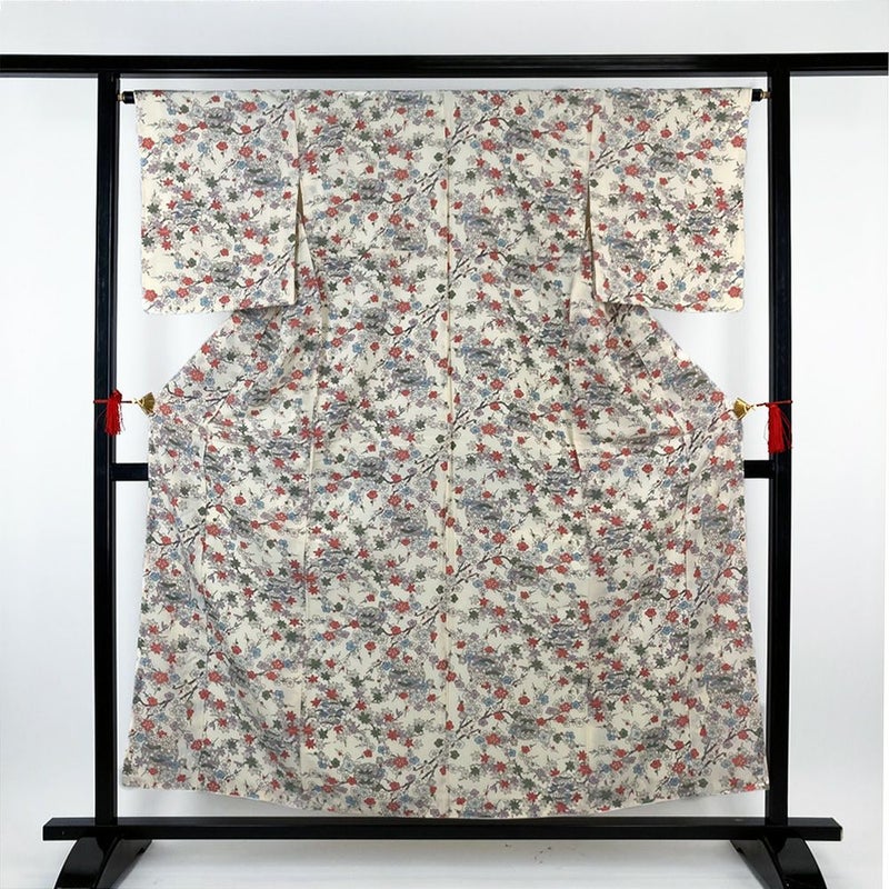 (中古)小紋 クリーム ポリエステル 洗える ちりめん調 梅 紅葉 雪輪 袷 SS【身丈】153cm 【裄丈】65cm