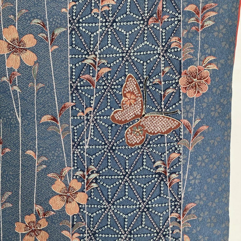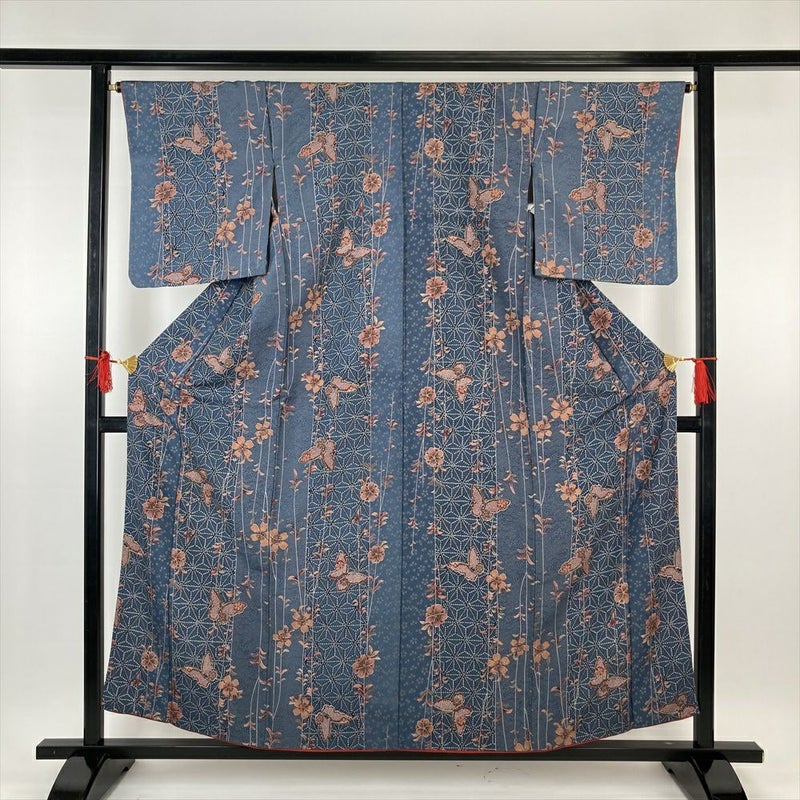 (中古)小紋 ブルーグレー ポリエステル 洗える ちりめん調 鹿の子 蝶 花 麻の葉 青海波 紗綾型 袷 S【身丈】155cm 【裄丈】66cm