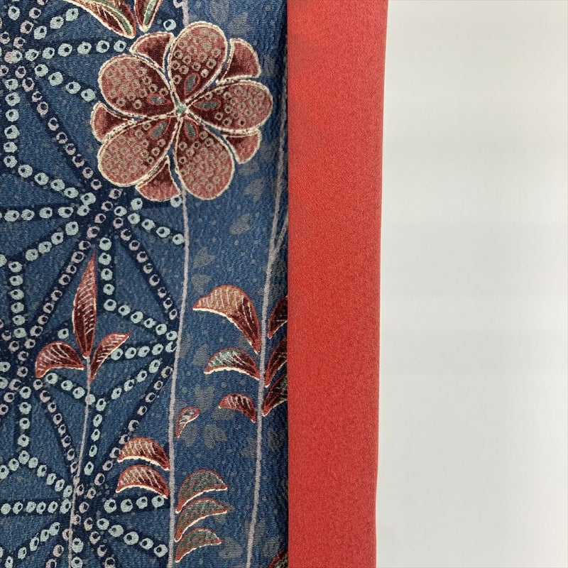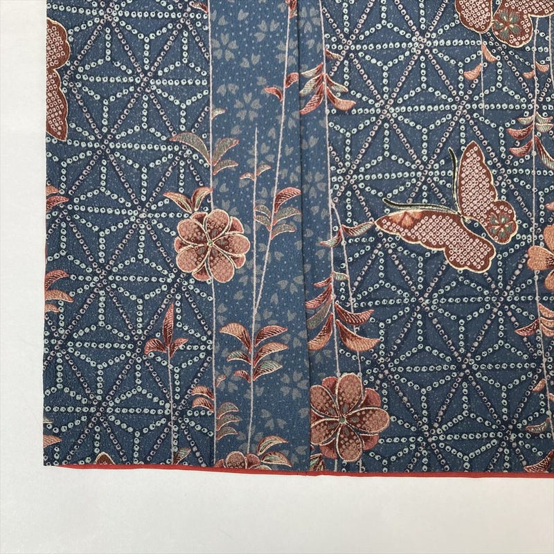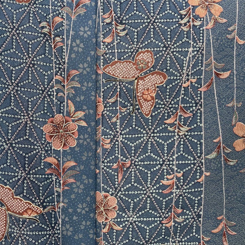【色柄】ブルーグレー ポリエステル 洗える ちりめん調 鹿の子 蝶 花 麻の葉 青海波 紗綾型