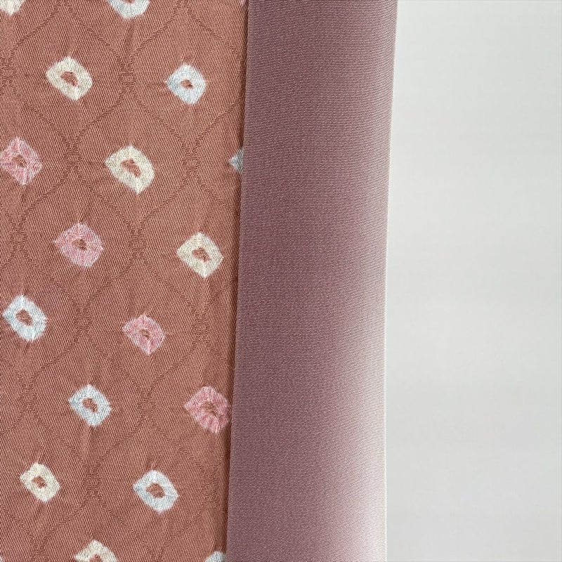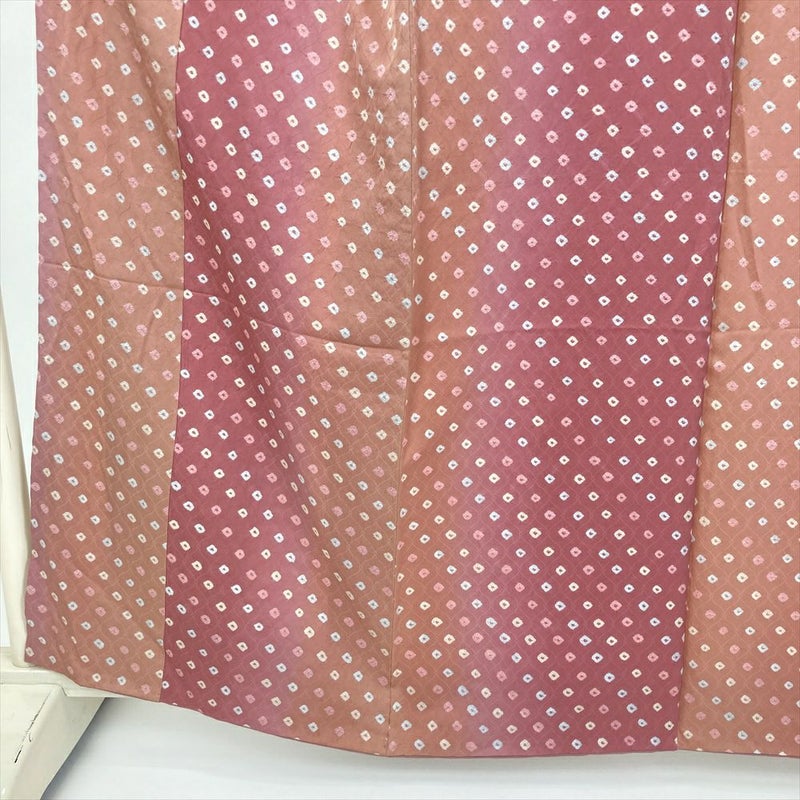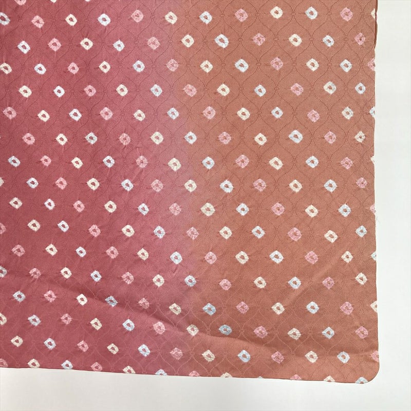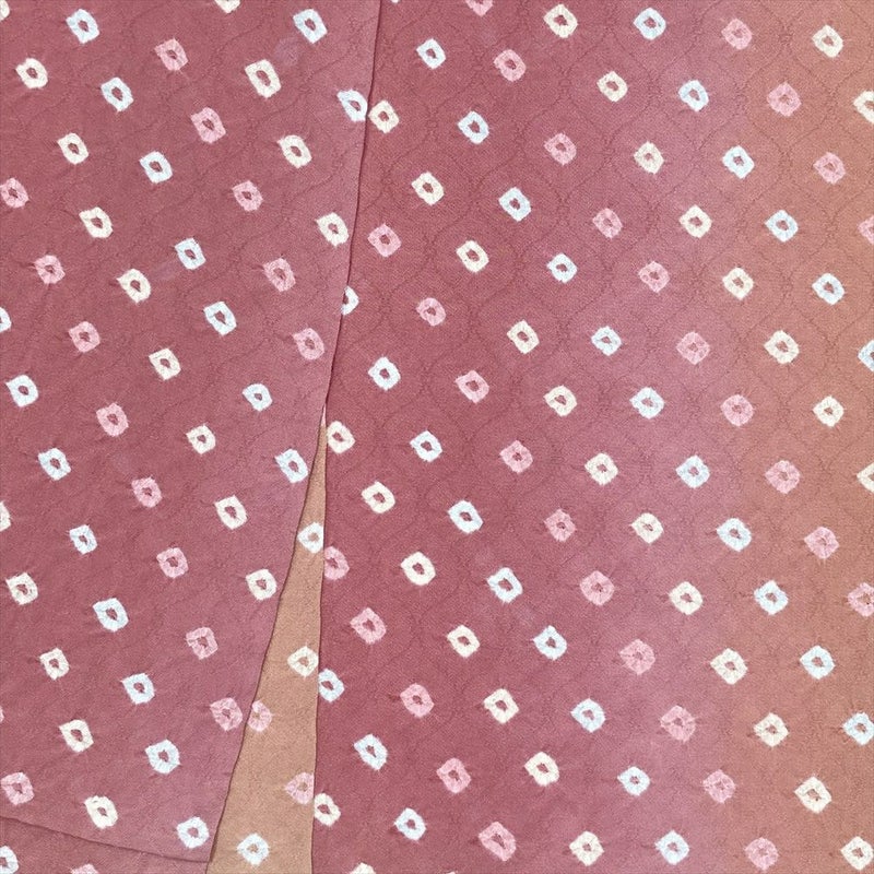 紅梅色に染まる地に、大粒鹿の子がはじけたように踊る絞りの小紋。
