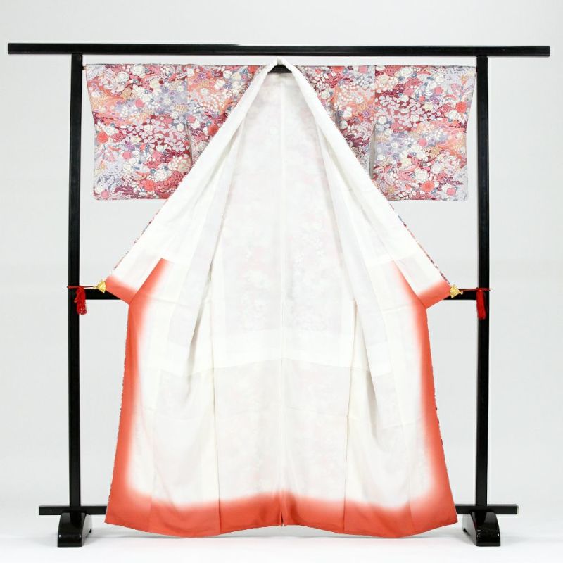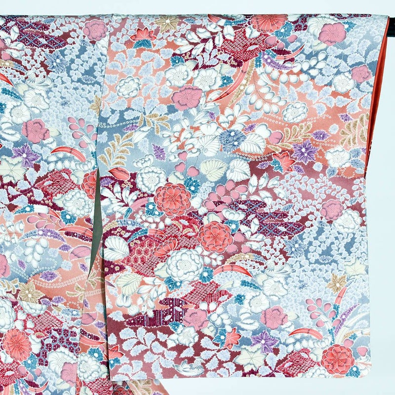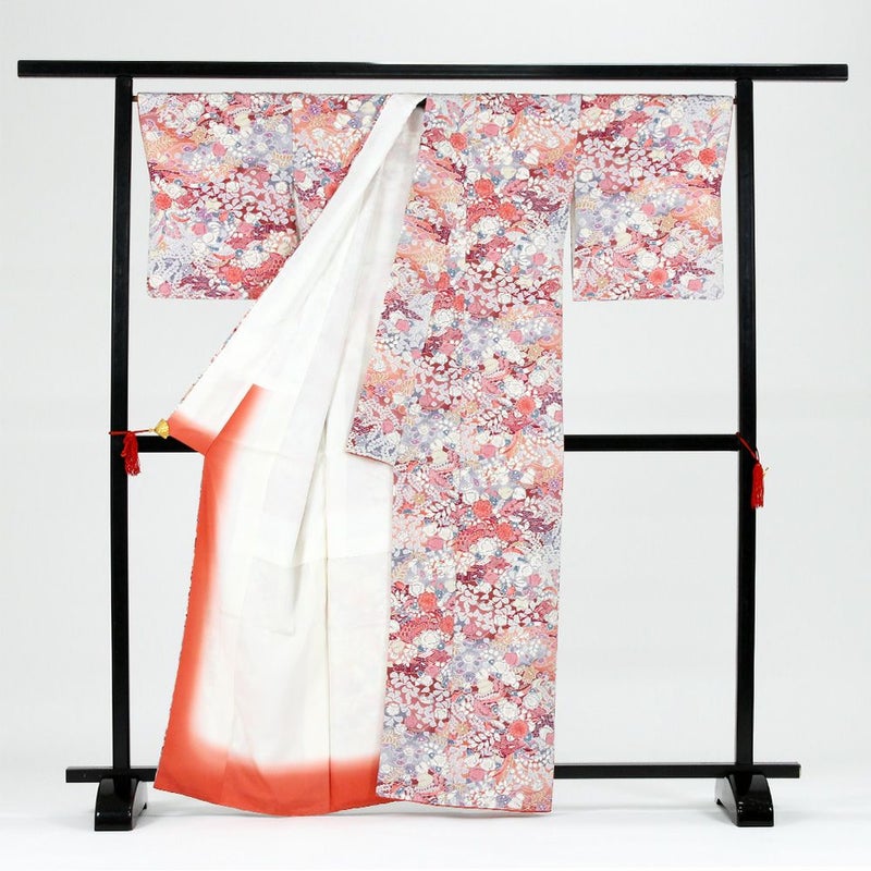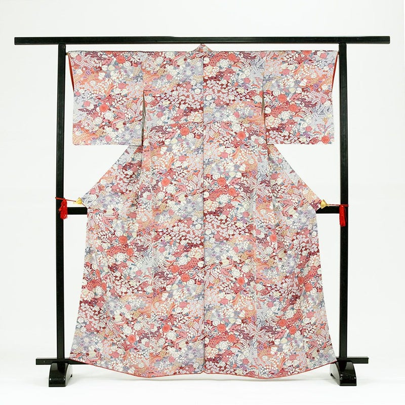 ピンク色の華やかな小紋です。全体的に辻が花文様があしらわれています。カジュアルな装いはもちろんですが、お稽古やちょっとしたお食事会、お正月などのイベントにもおすすめです。