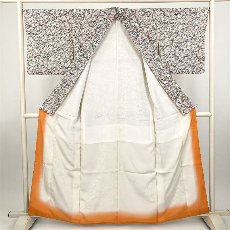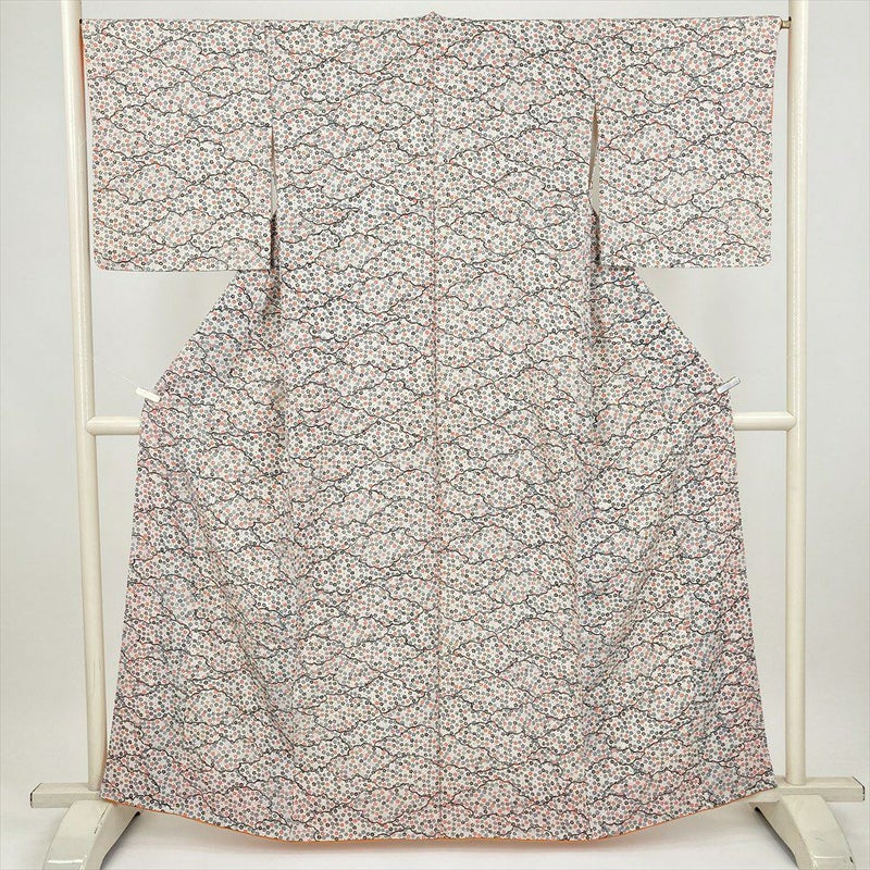 (中古) 小紋 白 カジュアル 雲取り 菊梅桜 袷 絹【身丈】157cm【裄丈】67cm