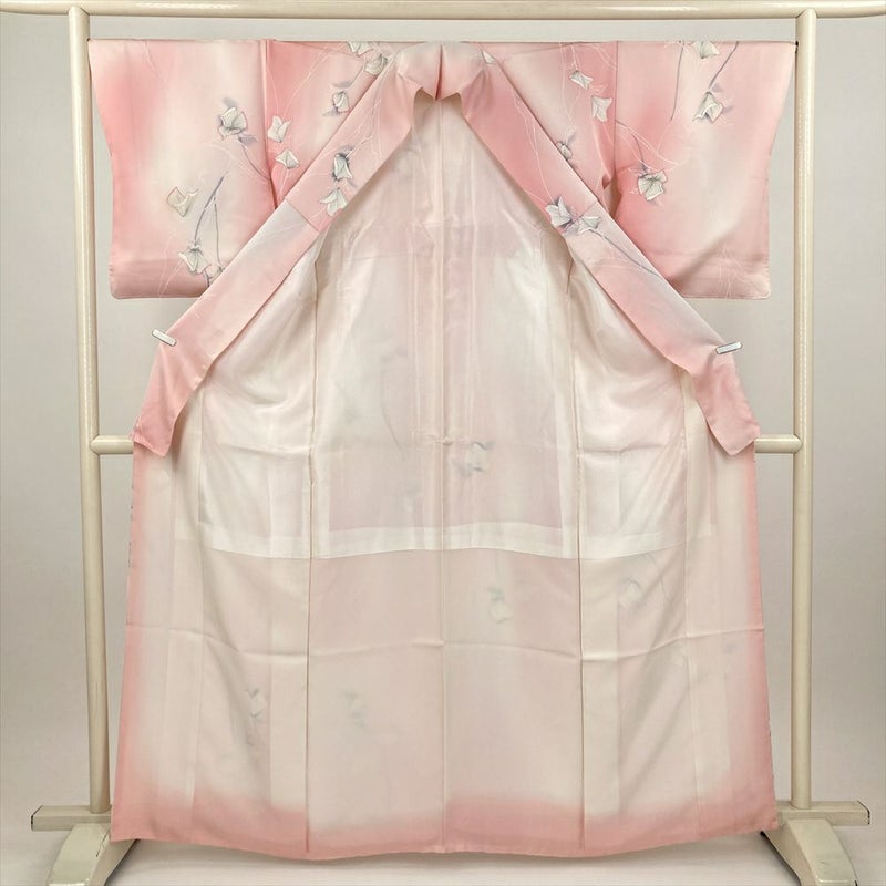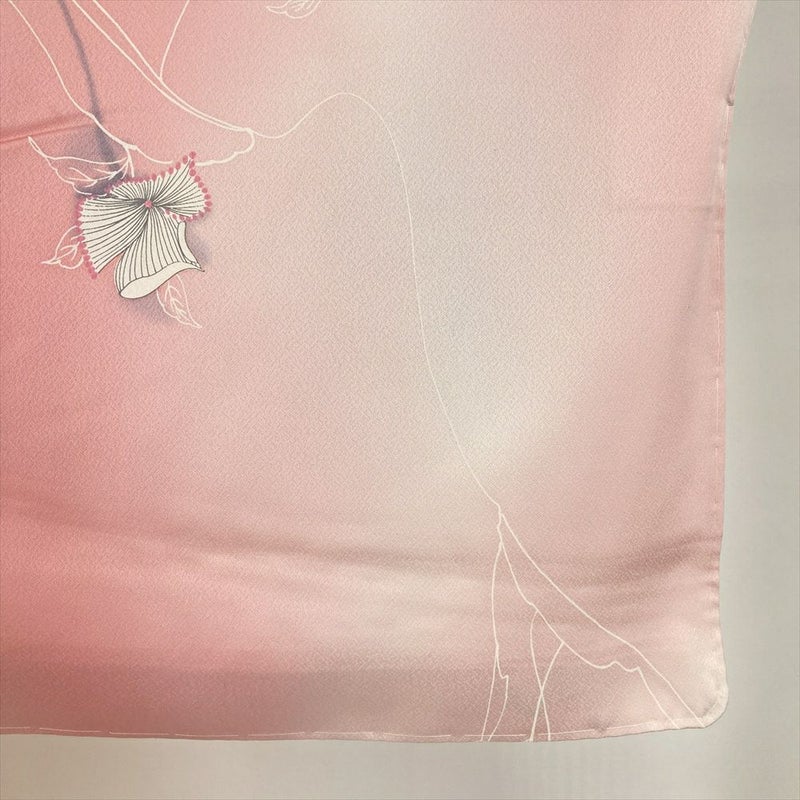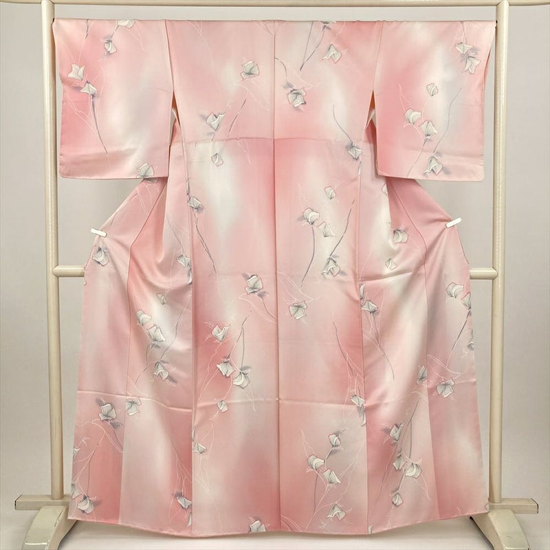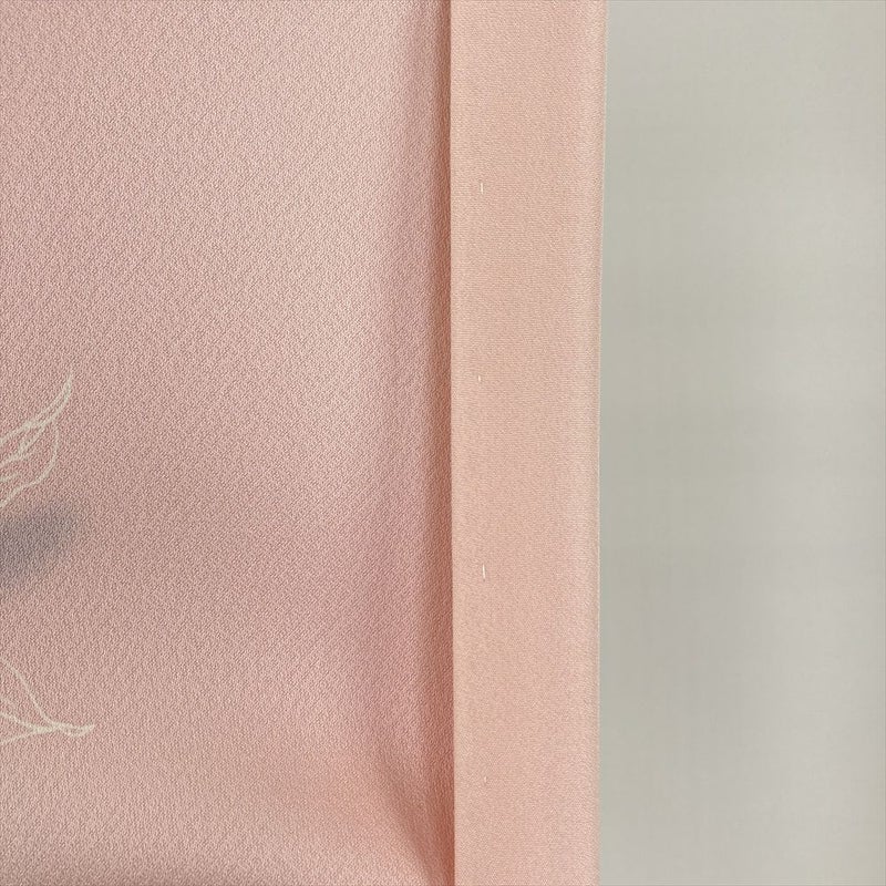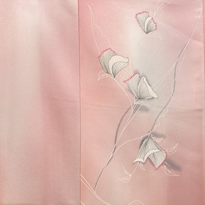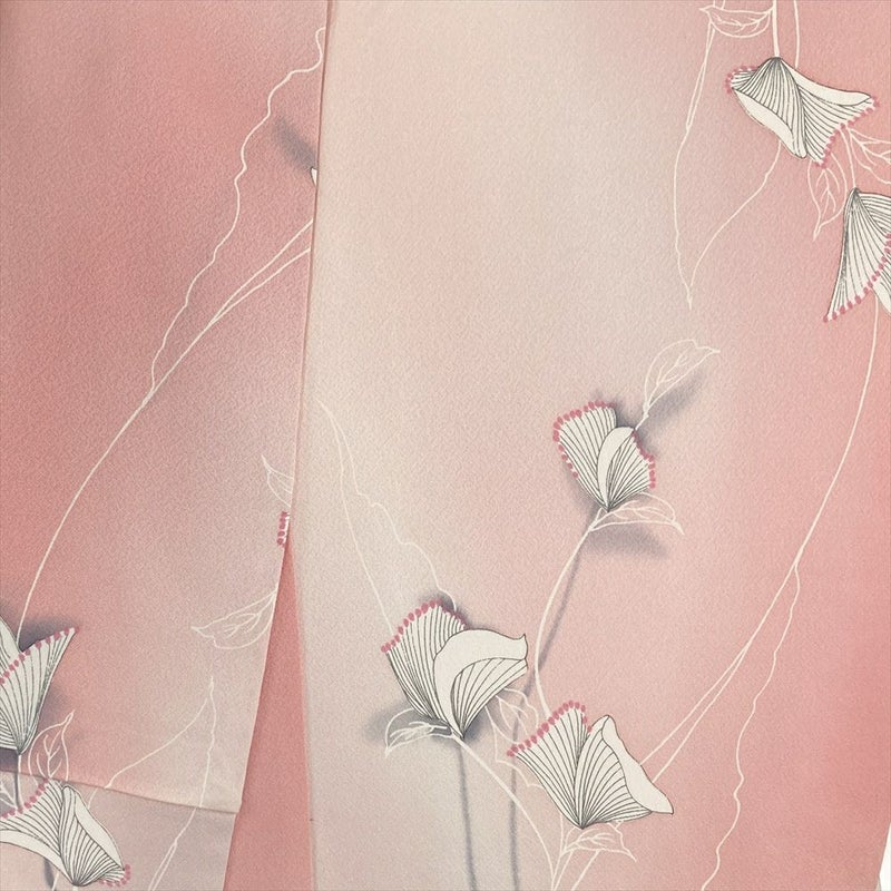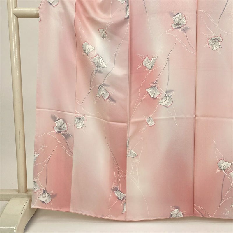 やわらかなピンクにぼかし染めで花をあしらった小紋。