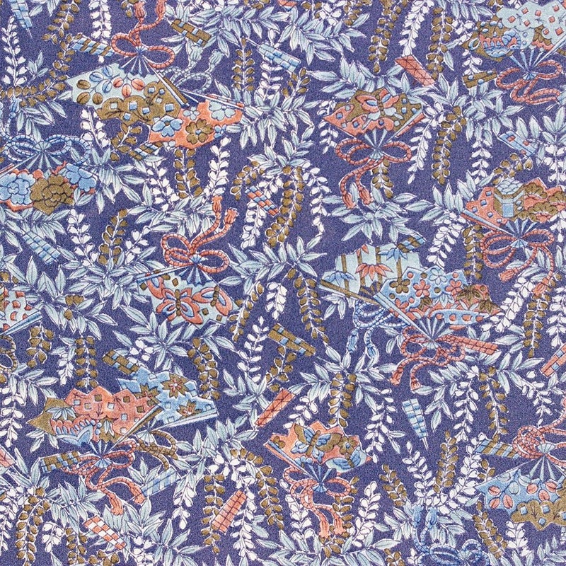 しなやかで上質な生地に、藤と扇の文様を総柄で丁寧に染め上げた小紋です。藤の花の優美な姿と、扇の雅やかな意匠が、古典的な美しさを際立たせます。繊細な染めによる、上品な色彩と柄の表現をお楽しみください。