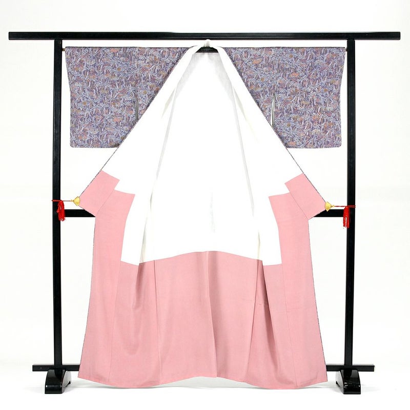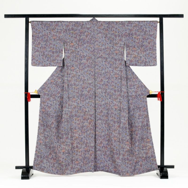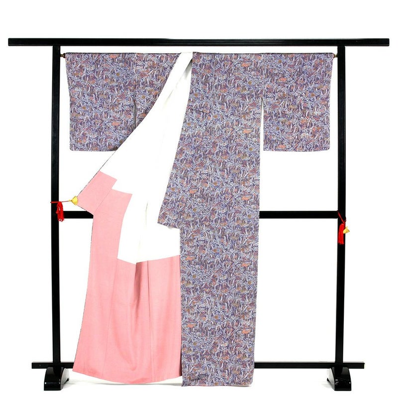 (中古)小紋 藤色地 総柄 染め 扇 袷 S【身丈】157.5cm【裄丈】66.5cm