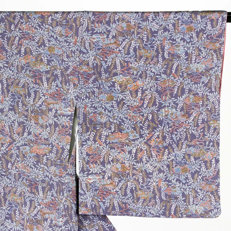 古典の美をまとう、上品で華やかな一着。藤と扇の優美な総柄が、装いを格調高く彩ります。