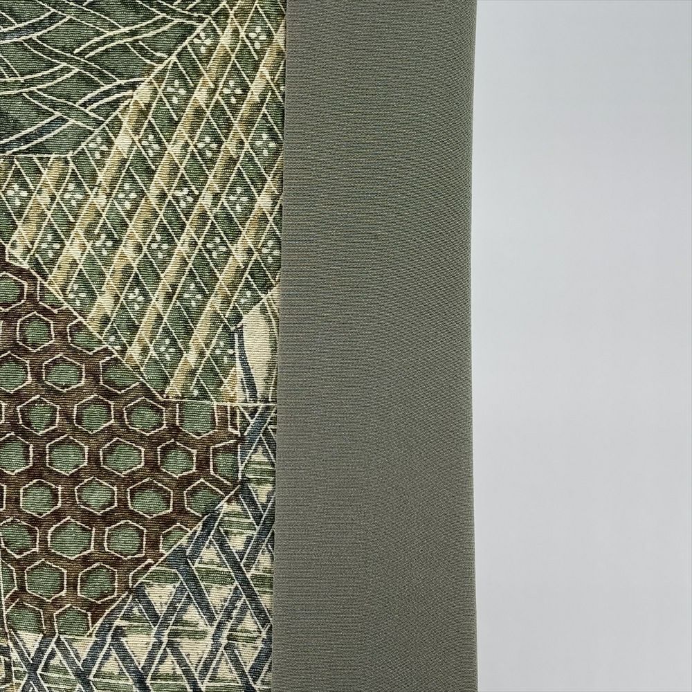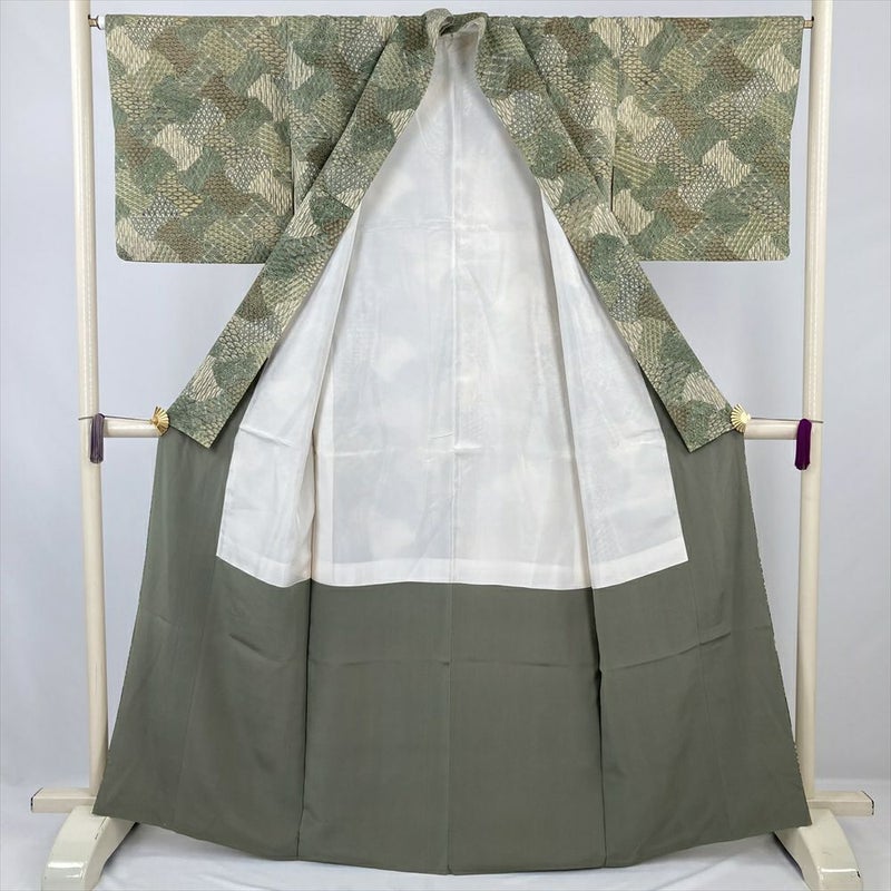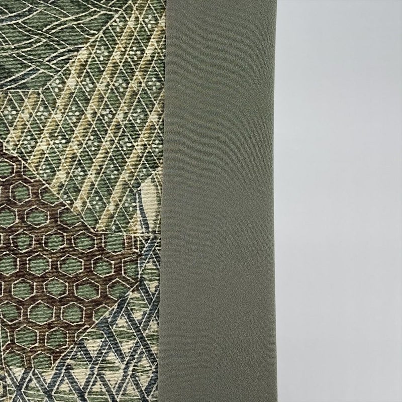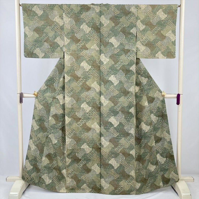 (中古) 小紋 緑 カジュアル 切り嵌め 袷 絹【身丈】159.5cm【裄丈】65.5cm