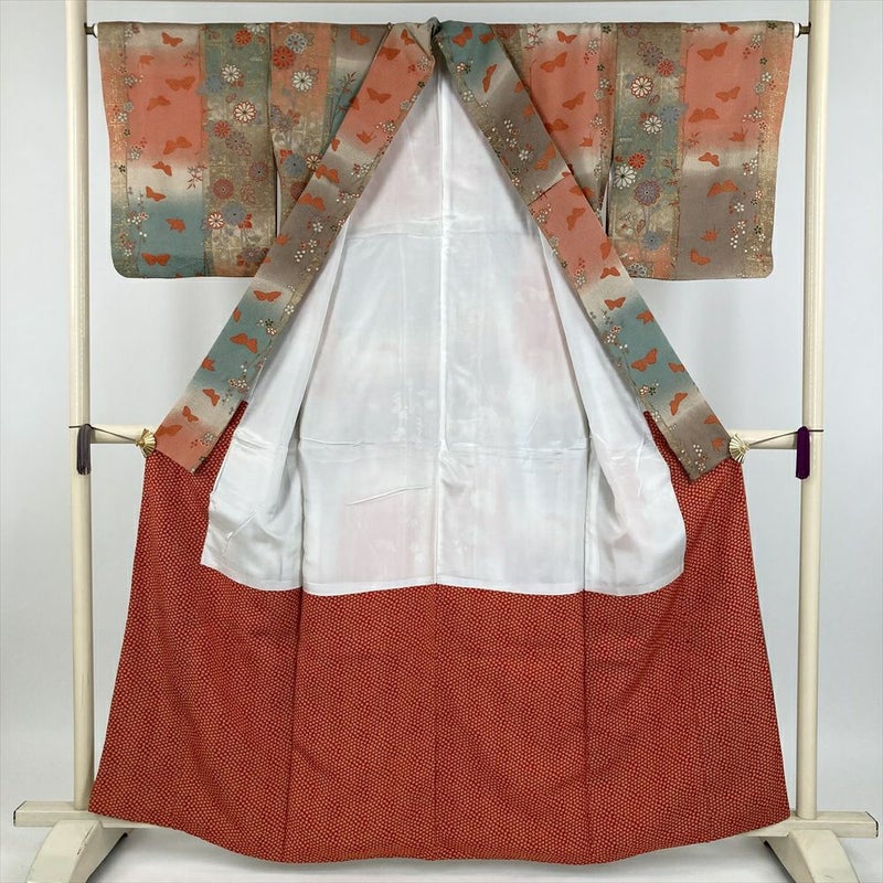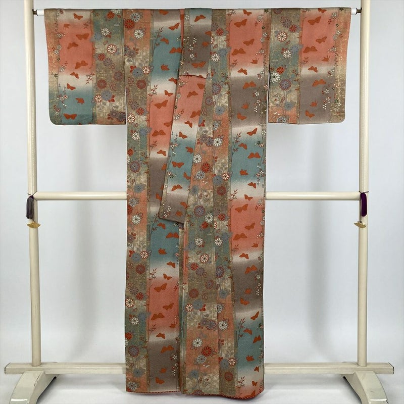 (中古) 小紋 橙色 灰青色 茶色 マルチカラー カジュアル 地紋織り 染め 金彩 古典 袷 絹 【身丈】155.5cm【裄丈】65.5cm