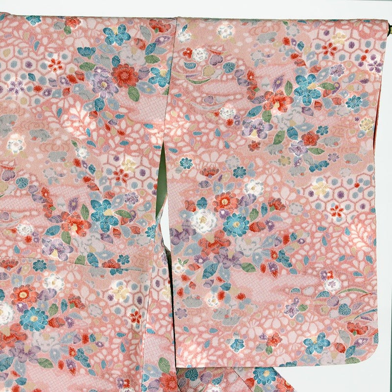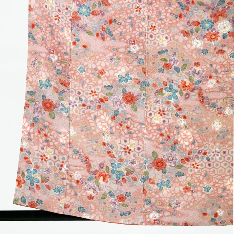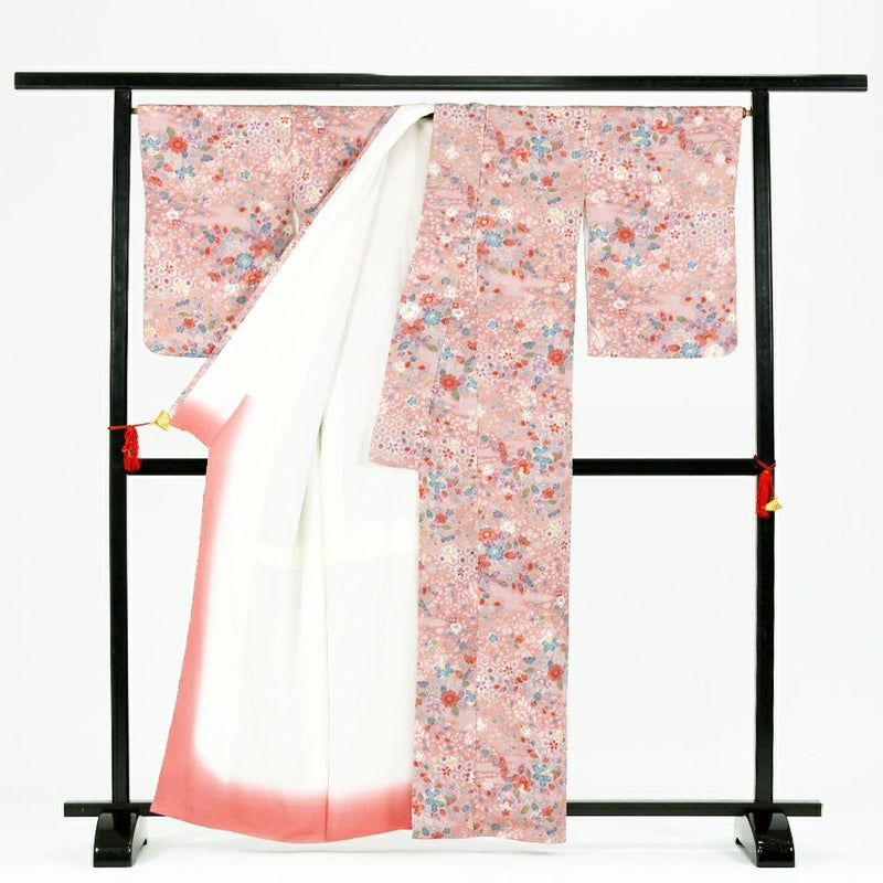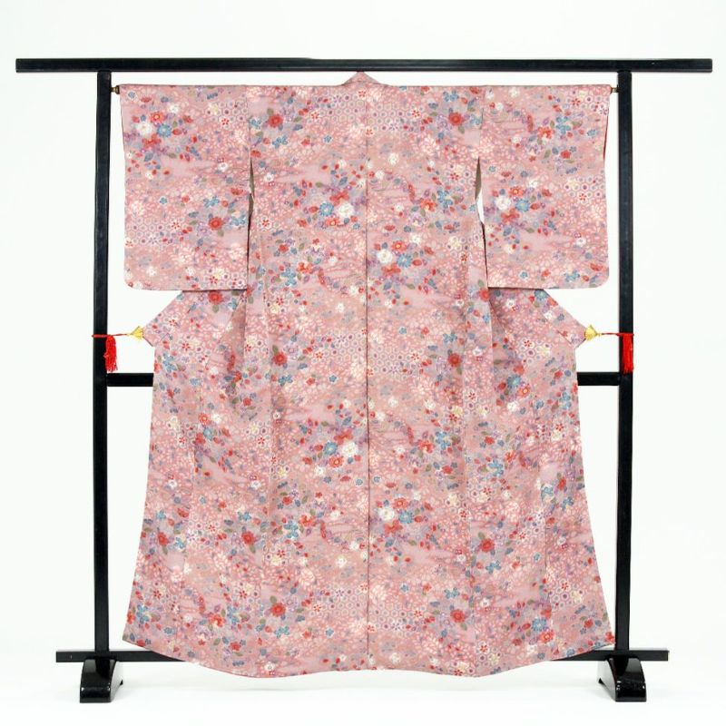 (中古)小紋 ピンク地 花柄 絞り 袷 S【身丈】157.5cm【裄丈】66.5cm