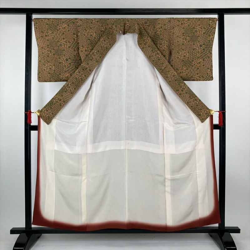 お洒落な街着として、ちょっとしたお出かけや、お稽古着としてお使いいただけるお着物です。茶・緑・紫のシックな色合いで構成された柄が落ち着いた印象です。衿裏にスナップ後が1か所と小さな黄色い汚れが数か所、胴裏の背中心にシミが一か所ありますが、着用には問題ありません。