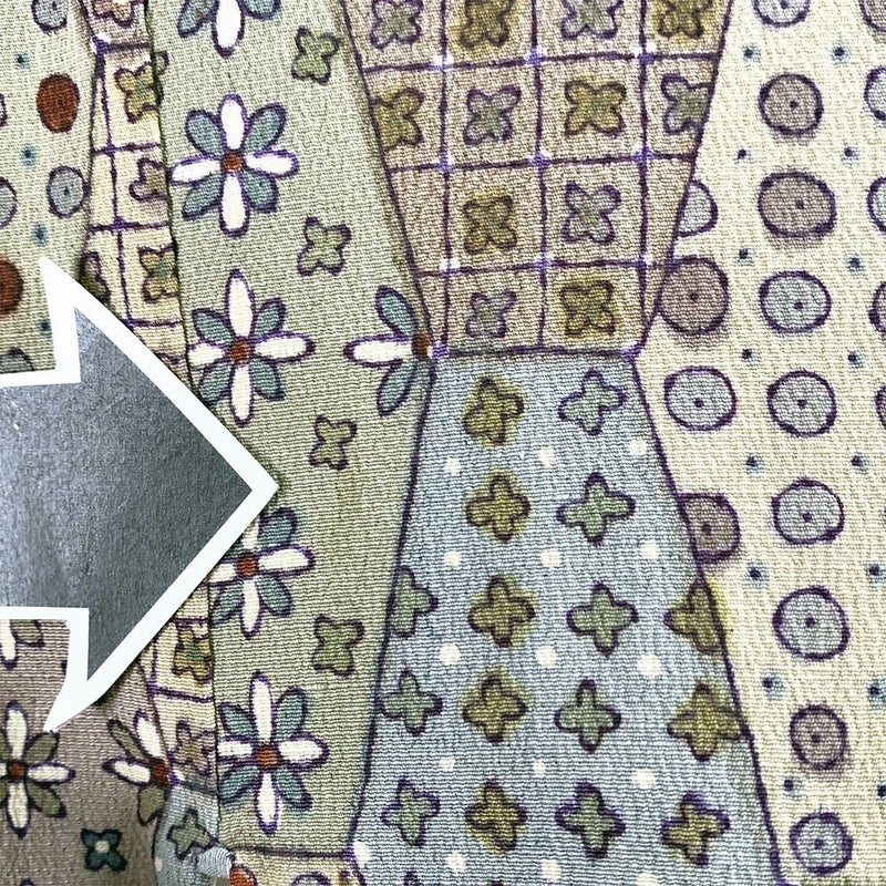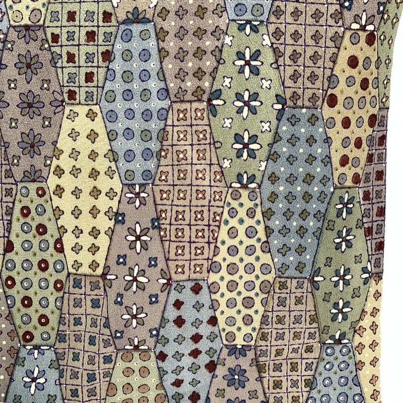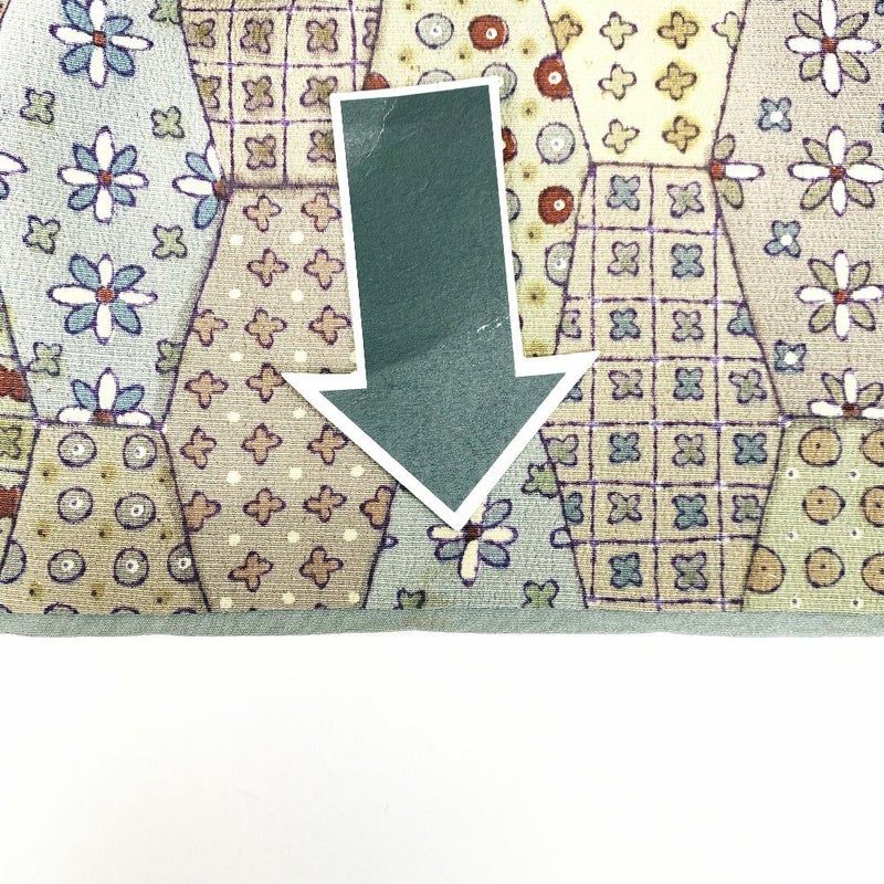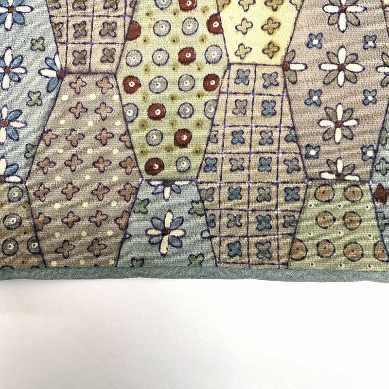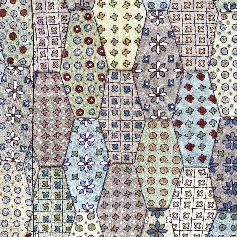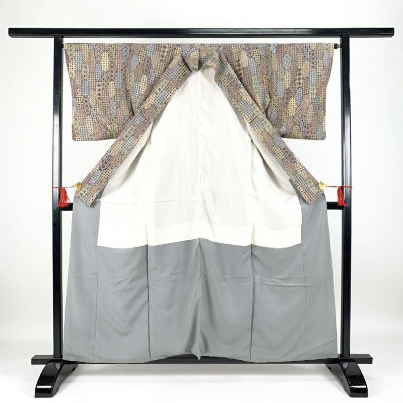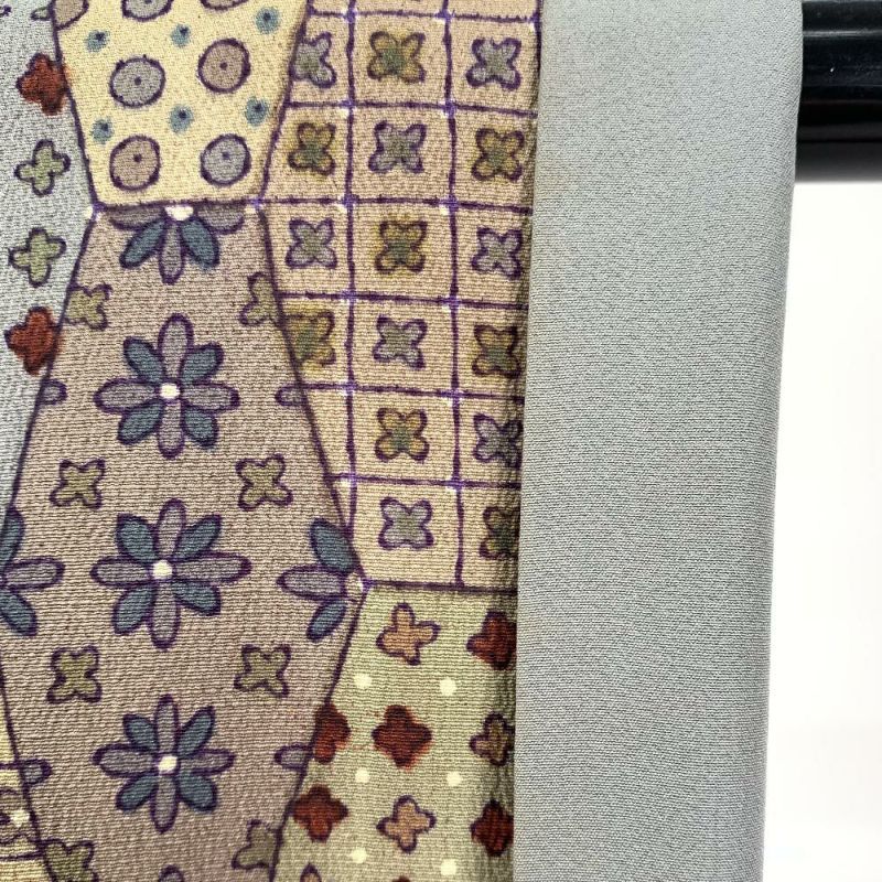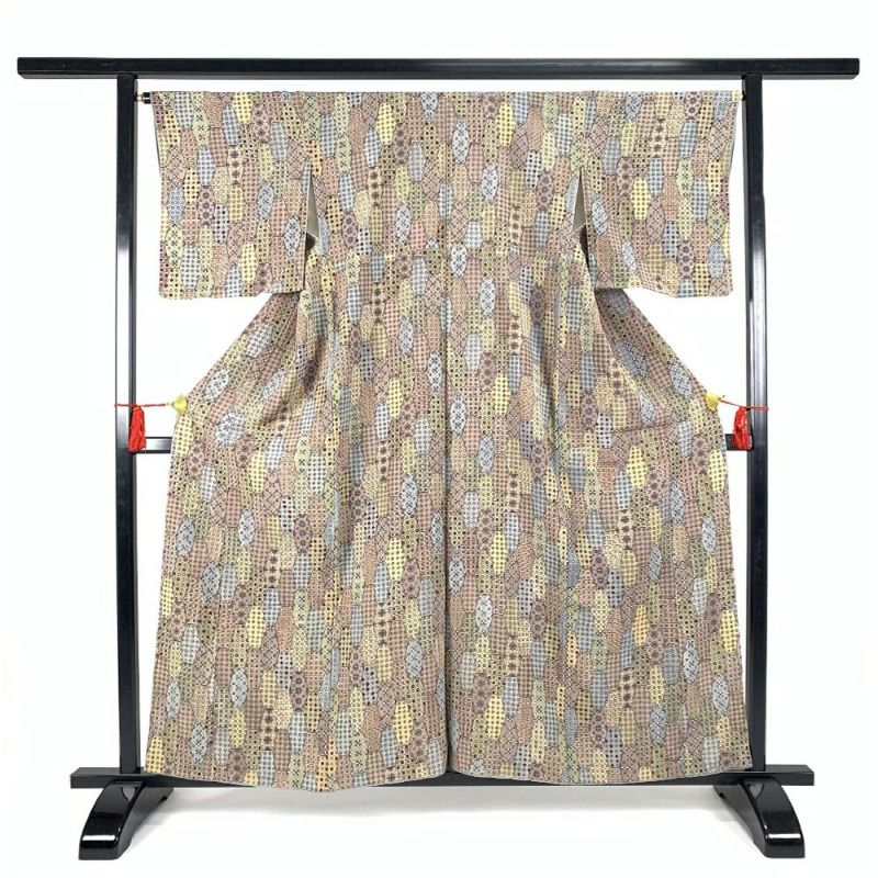 縦長の亀甲格子の中に各種の小紋柄を描いたパッチワーク調の小紋です。表裏各所に黄変が見られます。お稽古や普段使い程度でしたら問題なくお使いいただけると思います。
