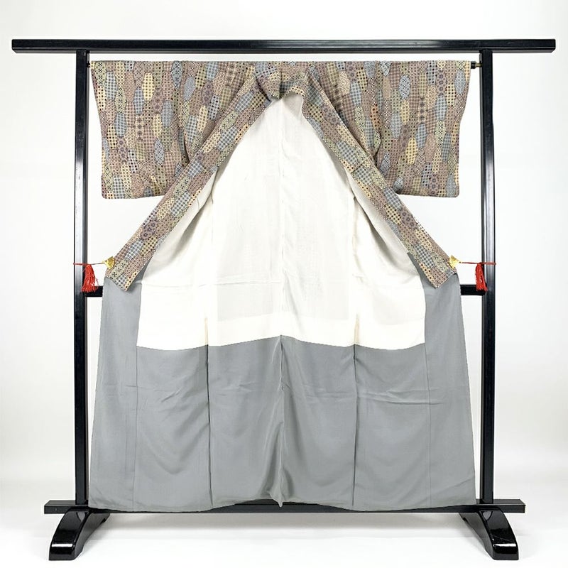 (中古)小紋 グレー地 亀甲 パッチワーク よろけ縞 幾何学模様 抽象的 格子 袷 S【身丈】155.5cm【裄丈】65.5cm