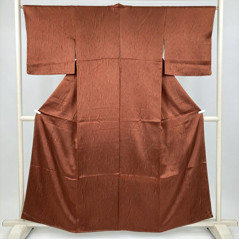 (中古) 小紋 赤茶 カジュアル 地紋織り 縫い締め絞り調 袷 絹【身丈】153cm【裄丈】67cm