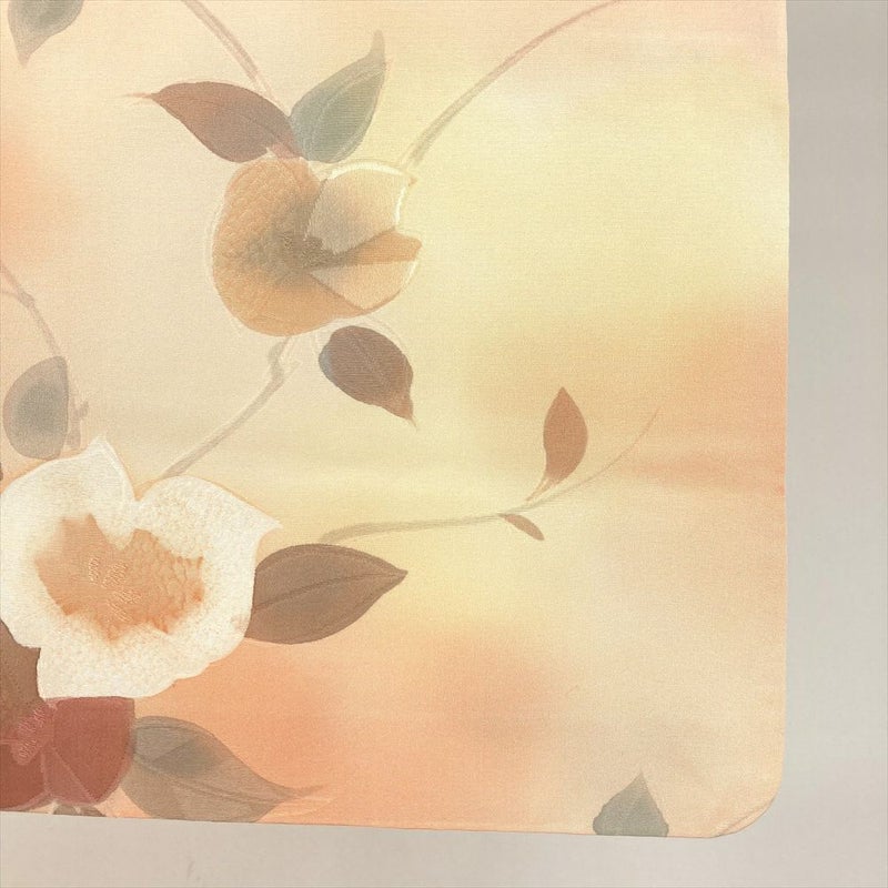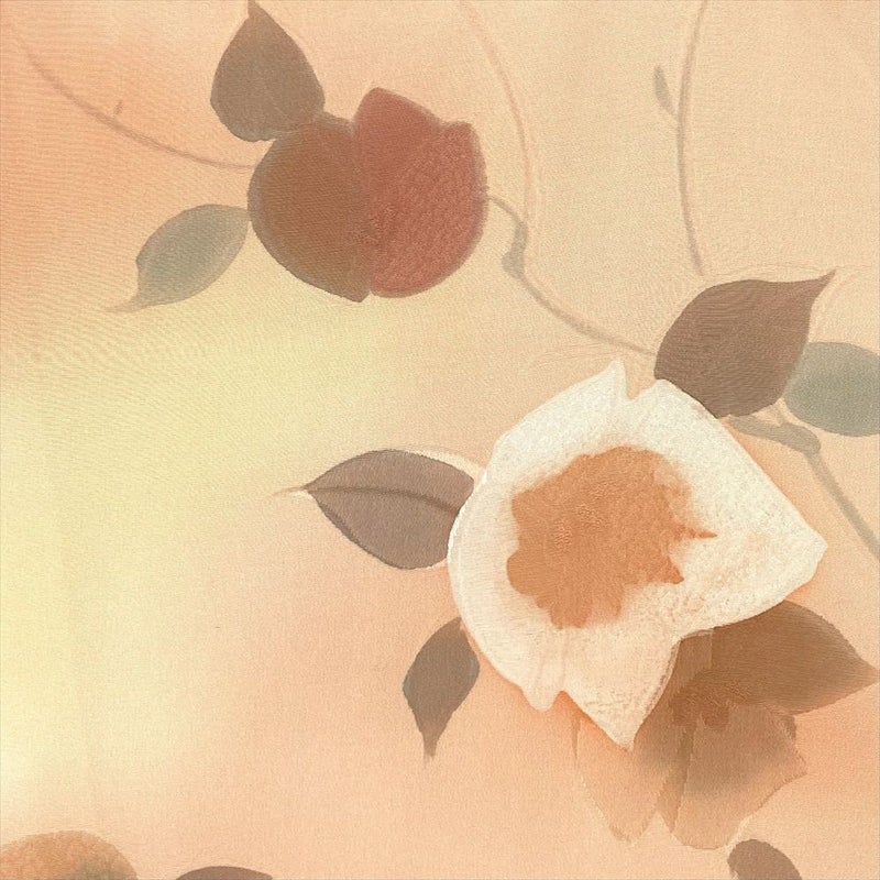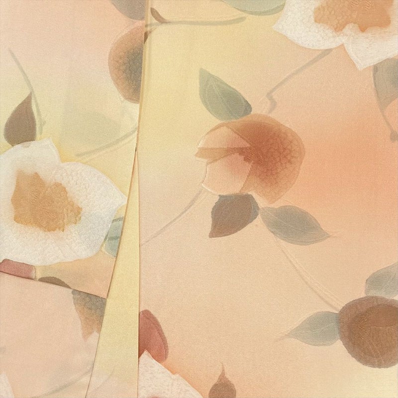 繊細な地紋織りの生地に、ぼかし染めで表現された花柄がふんわりと浮かび上がる一枚。