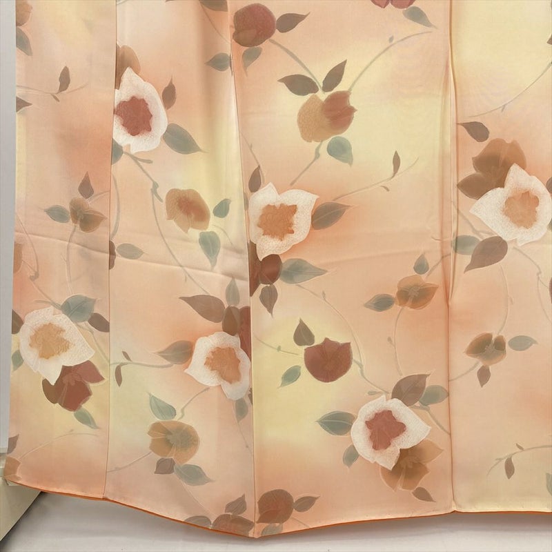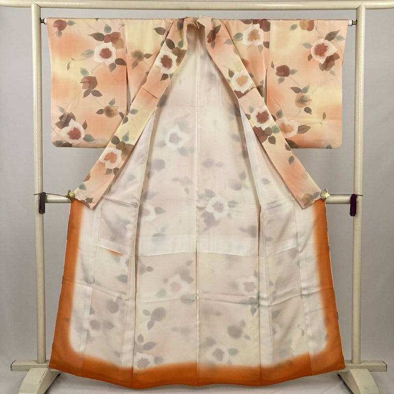 (中古) 小紋 ペールオレンジ カジュアル 花葉 袷 絹 【身丈】157.5cm【裄丈】65.5cm