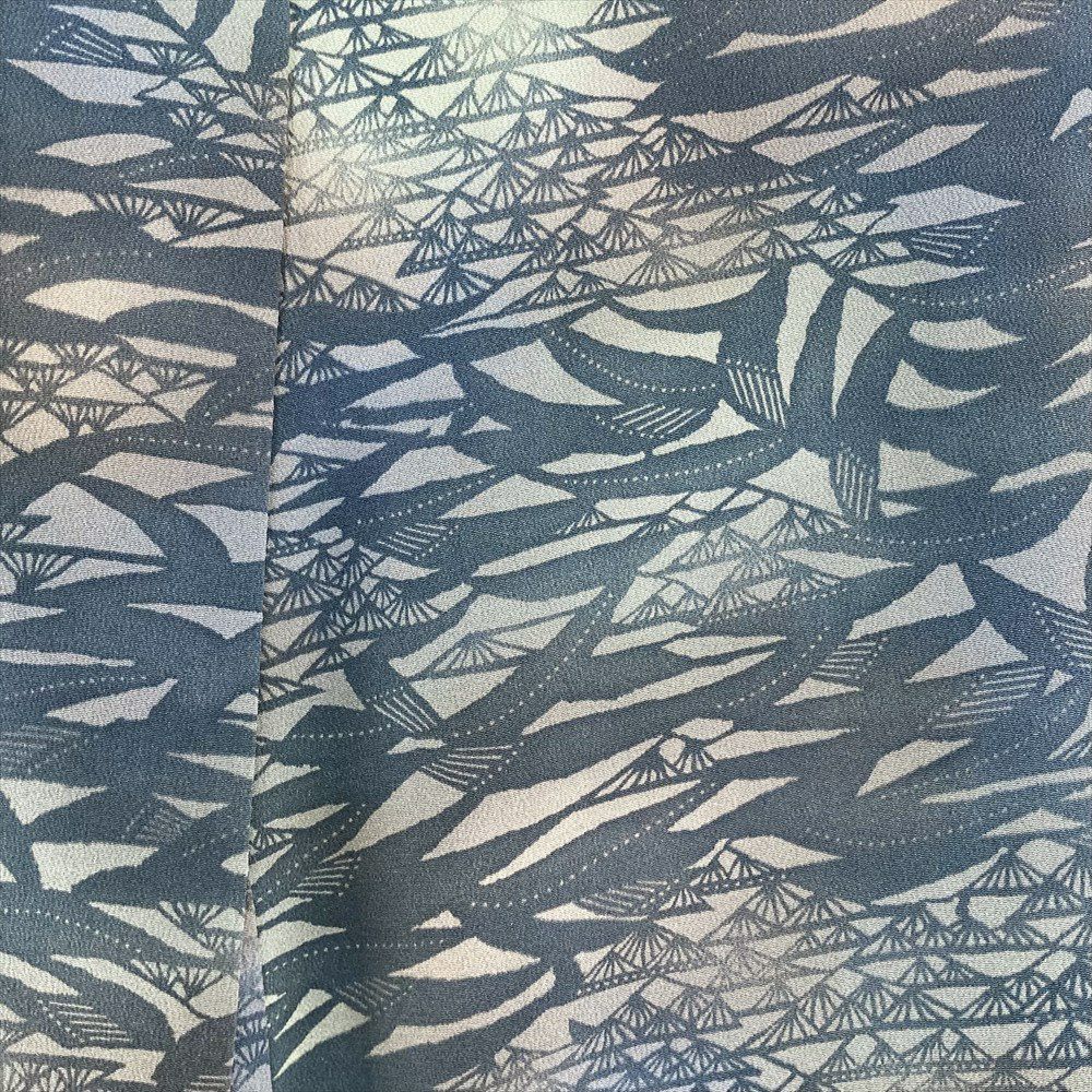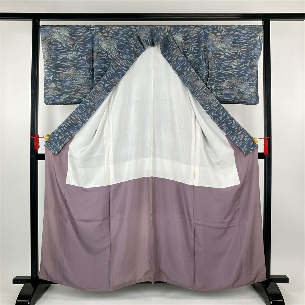 (中古)小紋 ブルーグレー カジュアル 縮緬 ぼかし 紅型 白波 波に筏 袷 S【身丈】155.5cm【裄丈】67.5cm