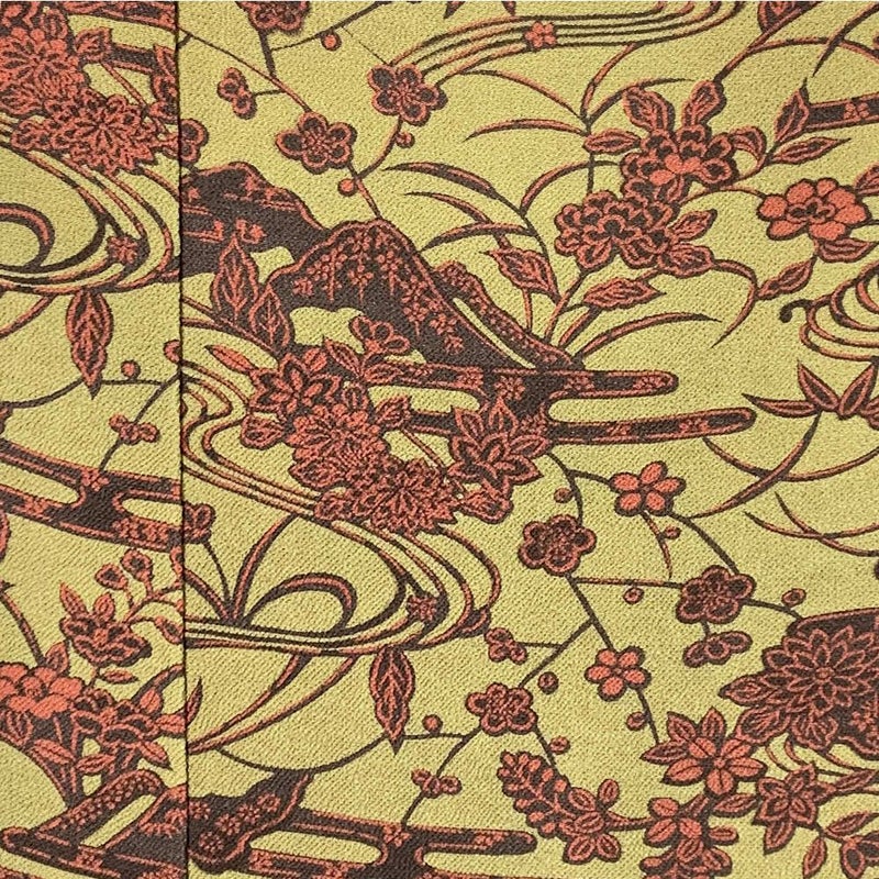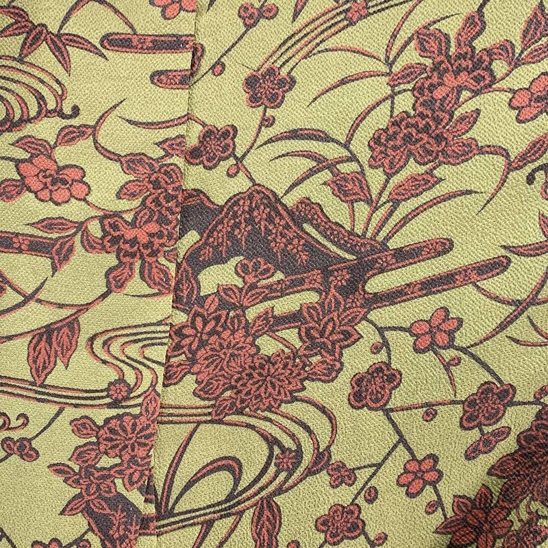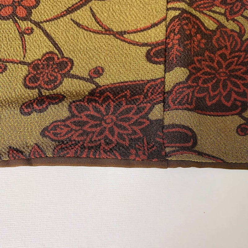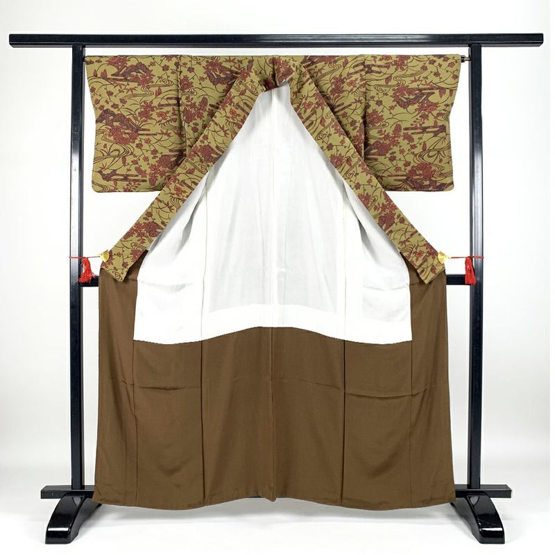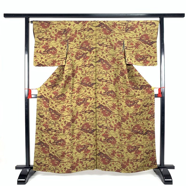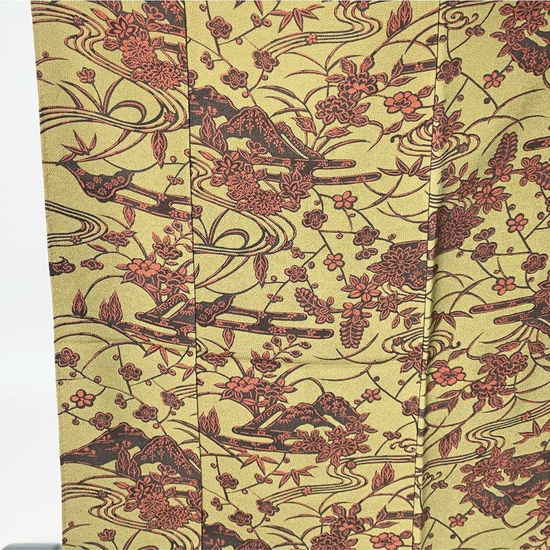 (中古)小紋 からし地 四季の花 流水 型染 袷 S【身丈】155.5cm【裄丈】66cm
