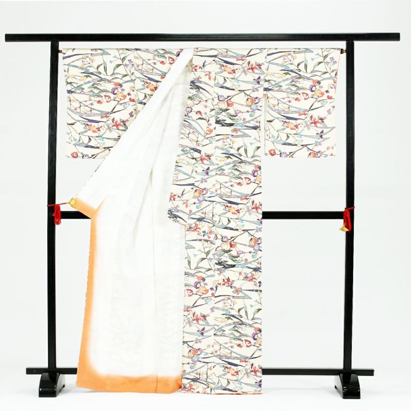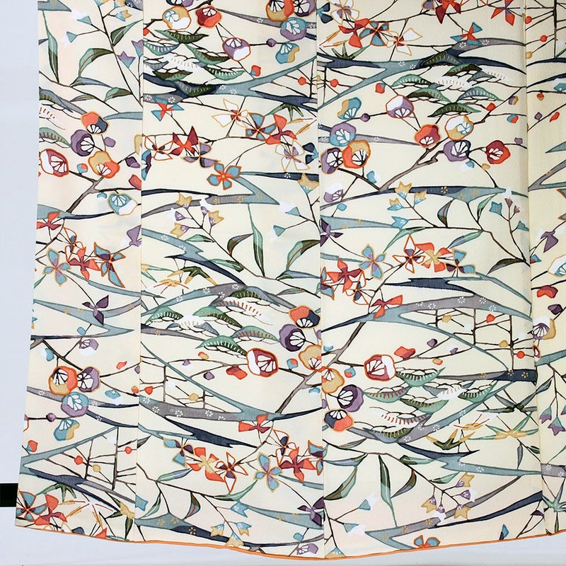 クリーム色の淡い優し気な地色にデザイン化された松竹梅のお花が型染されています。お出かけやカジュアルなシーンでお使いいただけます。
