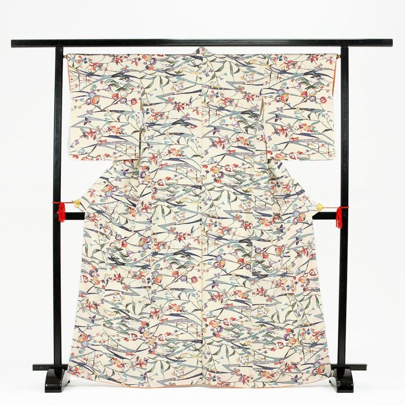 (中古)小紋 クリーム色地 紅型風 型染 ちりめん 松竹梅 袷 M【身丈】162.5cm【裄丈】66cm