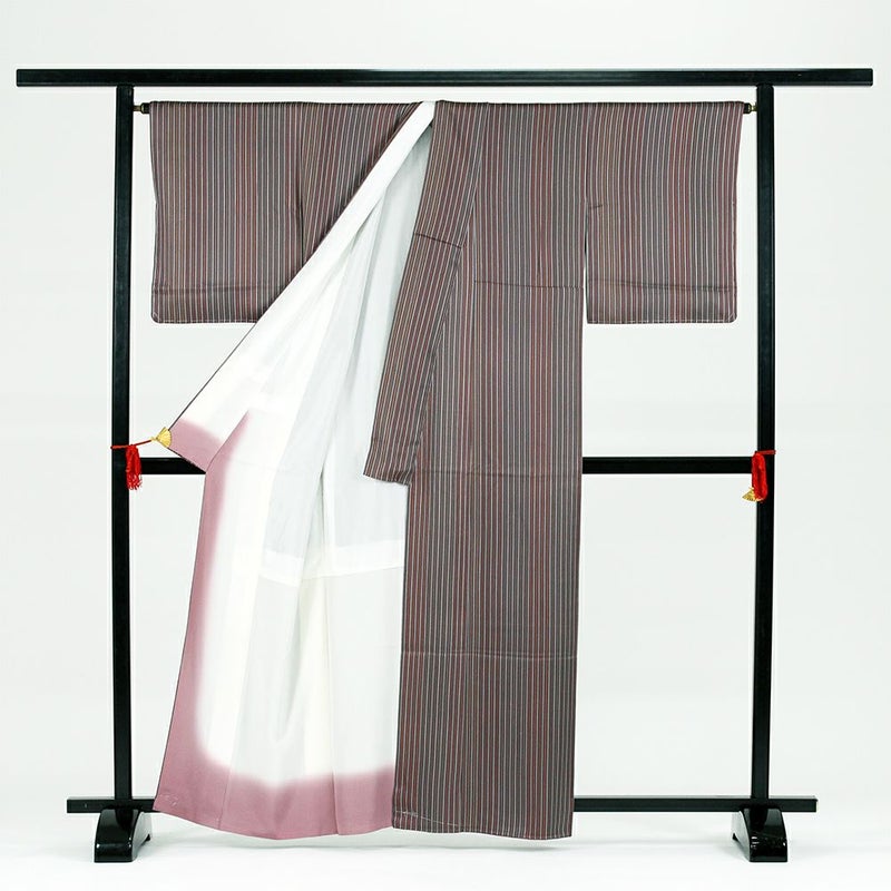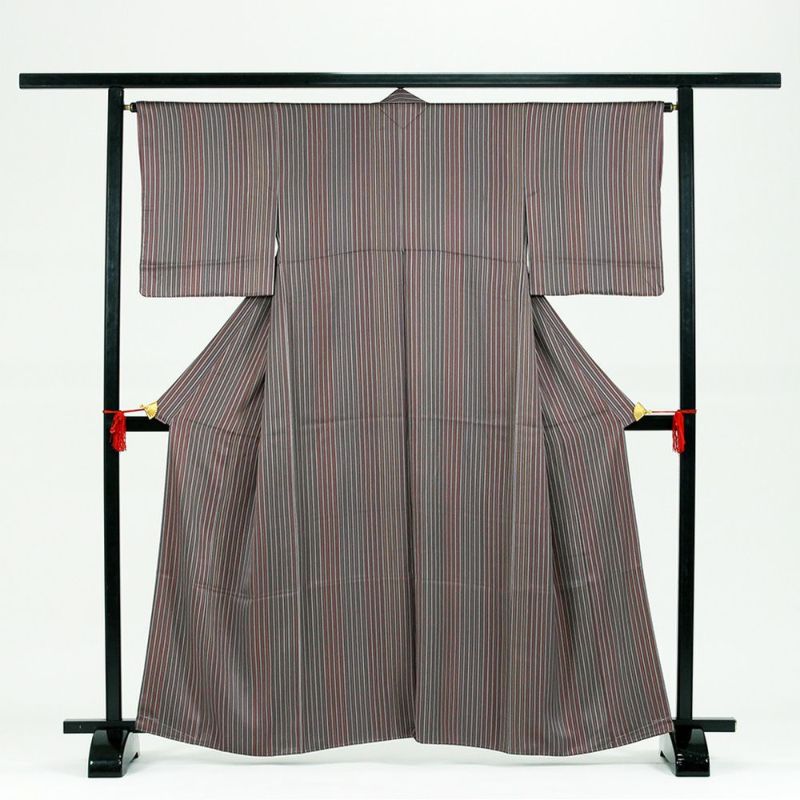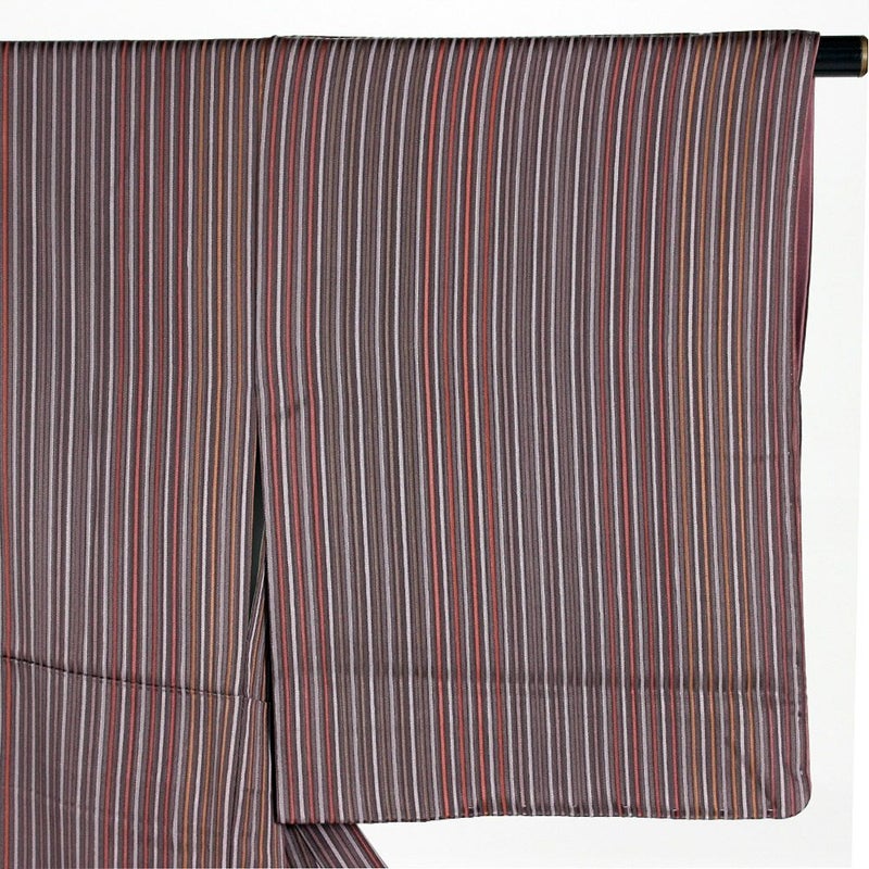 くすみ系の紫色で、ワイン色、ブロンズ、グレージュの縦縞の小紋です。秋冬におすすめカラーでカジュアルなシーンでお召いただけます。身巾ゆったりサイズです。裏に経年劣化に伴う黄変が見られます。着用には問題のない程度と思われます。しつけがあります。