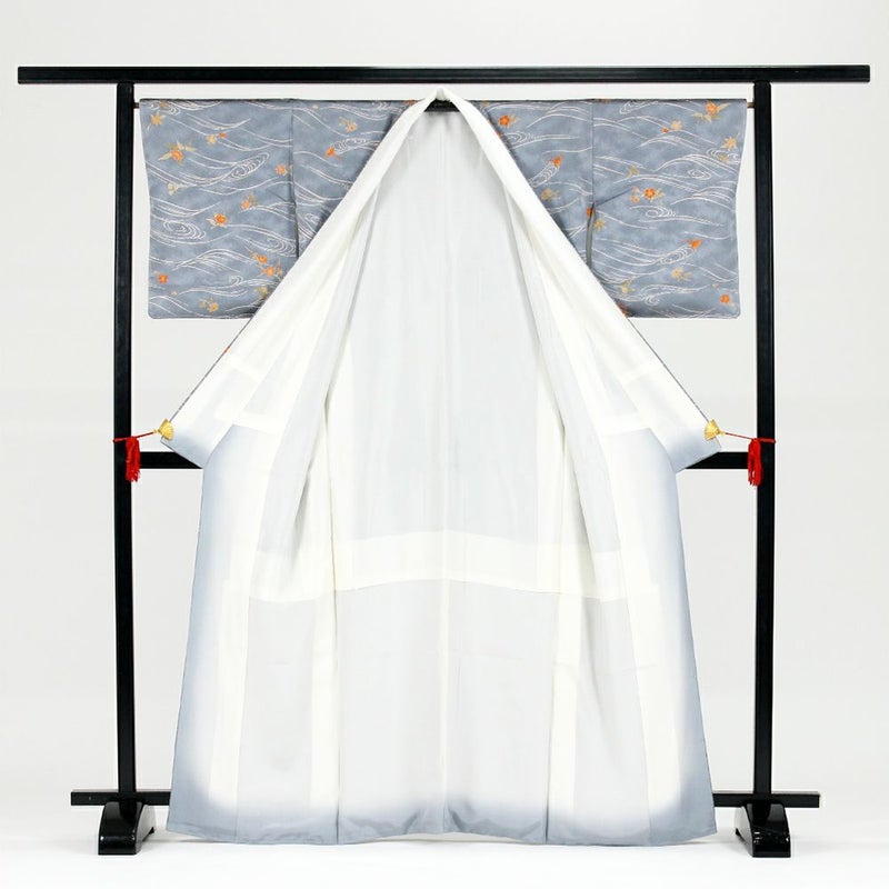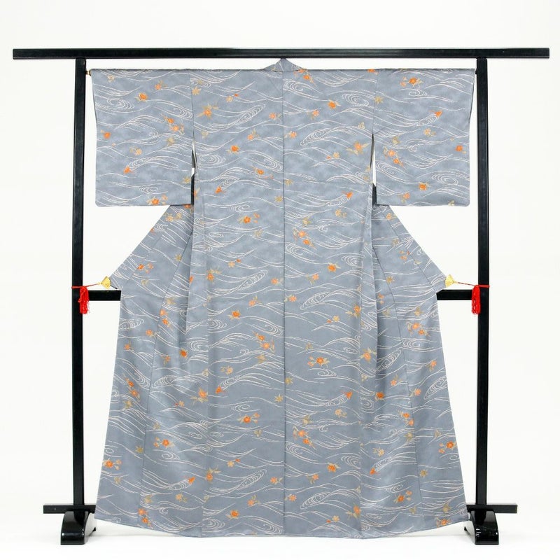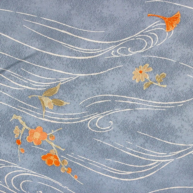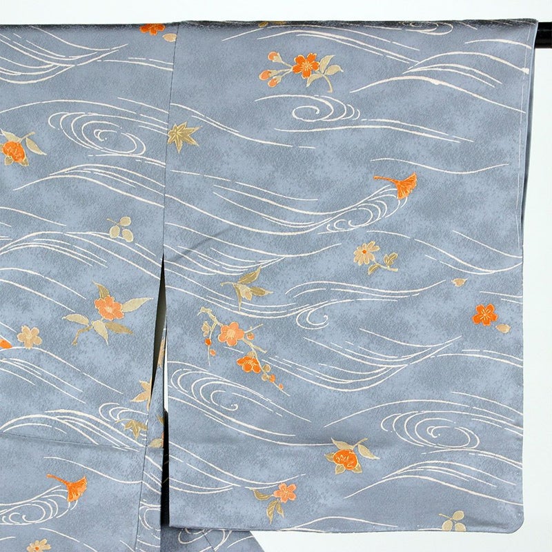 柔らかいブルーグレーの小紋に、流水と四季の草花が描かれています。落ち着いた地色ですが光沢感があり、お顔写りの良いお着物だと思います。お出かけやお稽古、などでお召いただけます。