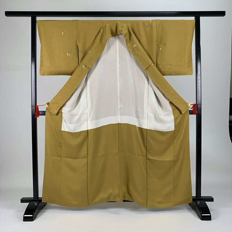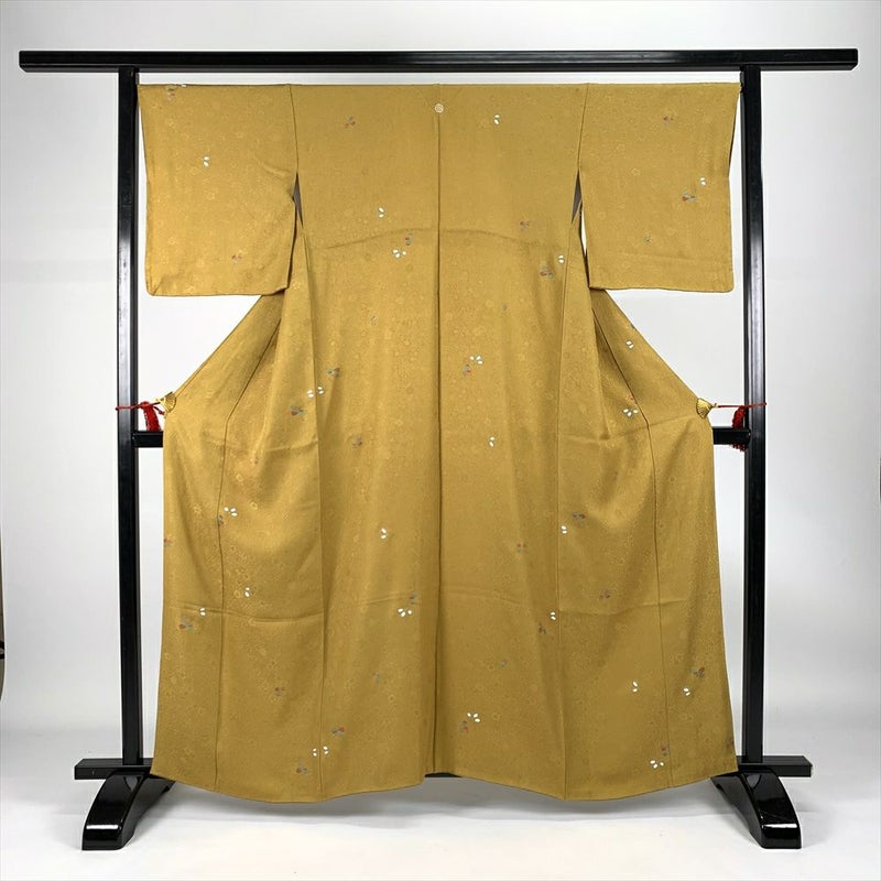 (中古)小紋 カジュアル からし 袷 一つ紋 地紋織り 総柄 葉 S【身丈】156.5cm【裄丈】68.5cm