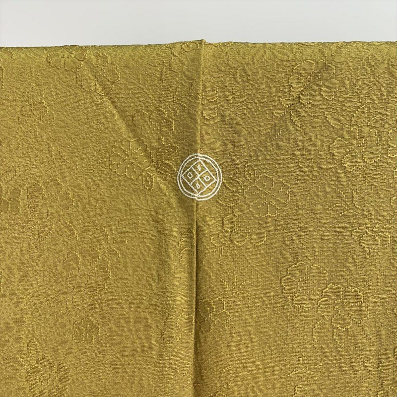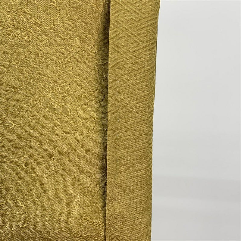 金色に近いからし色の地紋織りに、可愛らしい葉模様が総柄に施された小紋です。お稽古やお出かけなどカジュアルなシーンでお召しいただけます。しつけ糸あります。