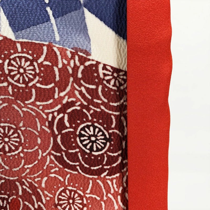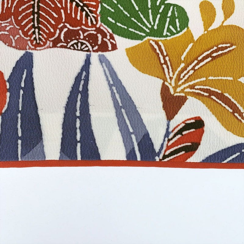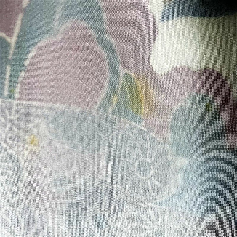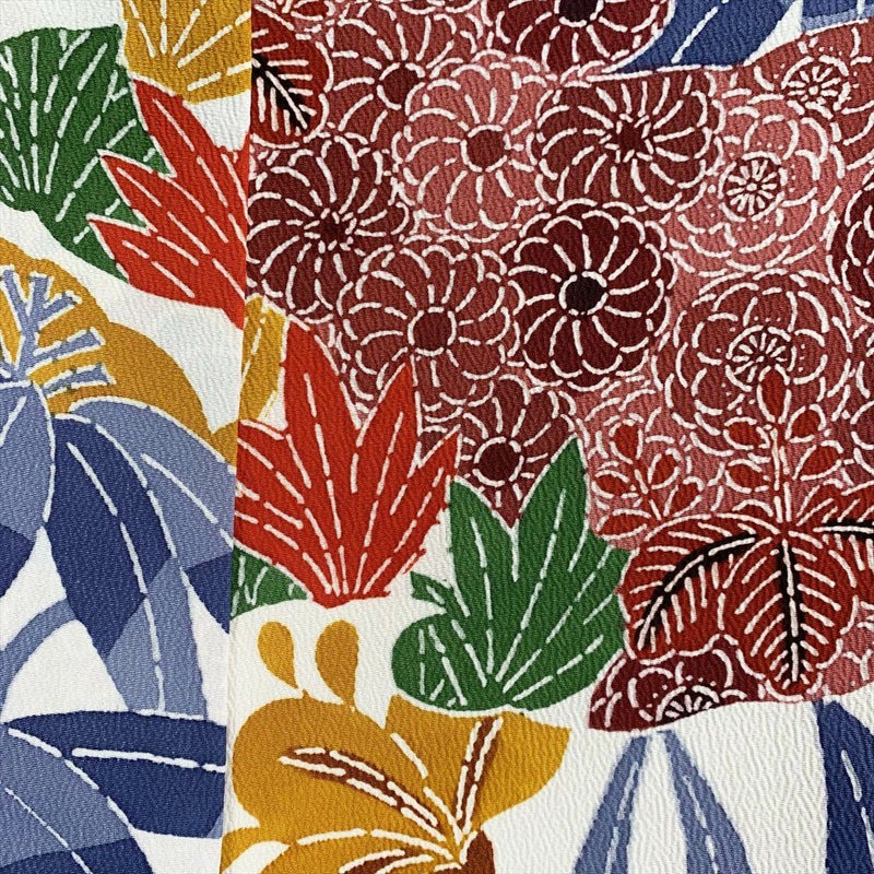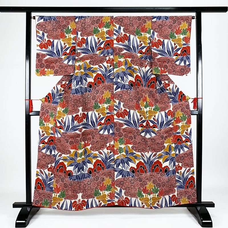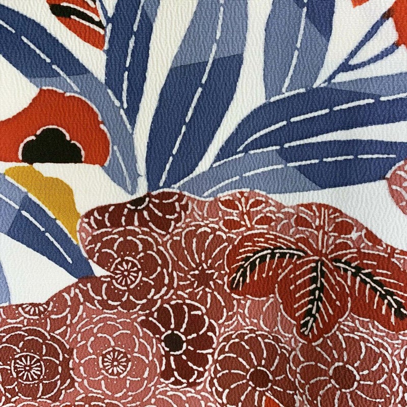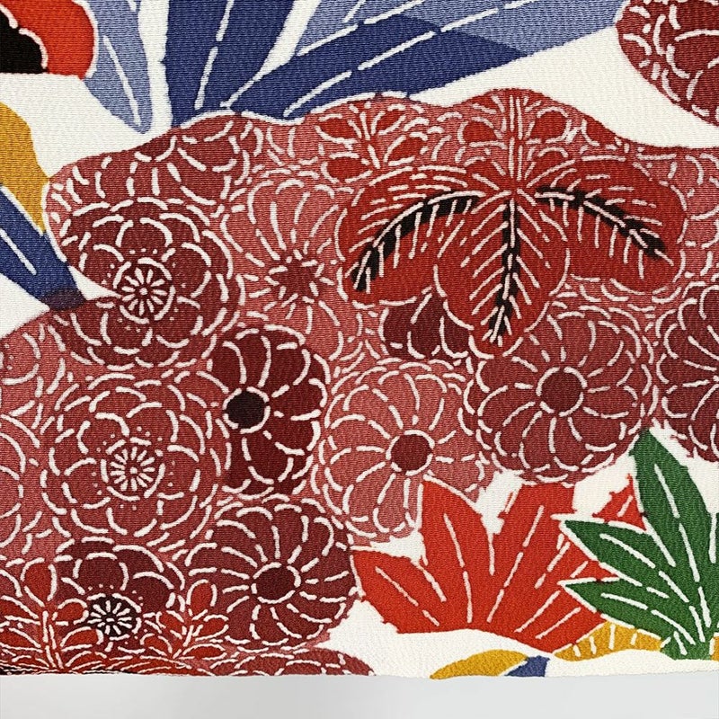 白のちりめんに紅型模様が艶やかに描かれた小紋です。おしゃれ着として、カジュアルなシーンでお召しいただけます。表地裏地ともに、薄いシミや黄変が多数ございます。