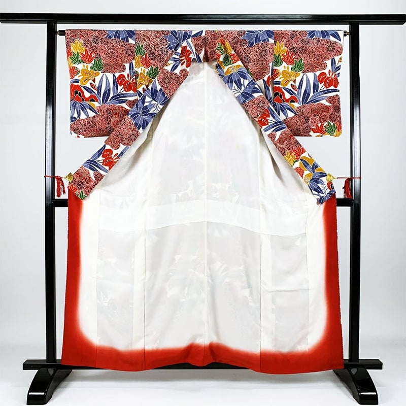 (中古)小紋 カジュアル 白 袷 紅型 ちりめん 菖蒲 草花 S【身丈】156.5cm【裄丈】66.5cm