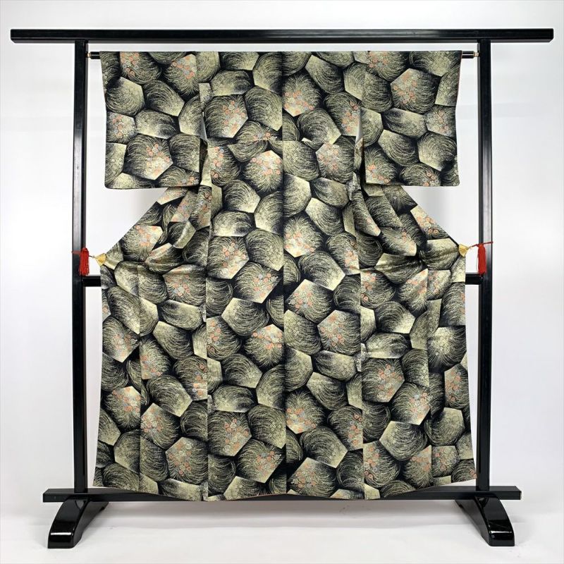 (中古)小紋 黒 カジュアル 地紋織り 草花 袷 S【身丈】155.5cm【裄丈】64.5cm