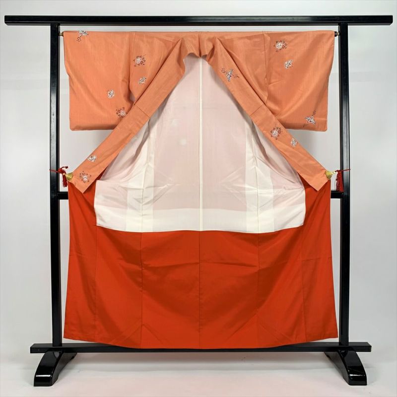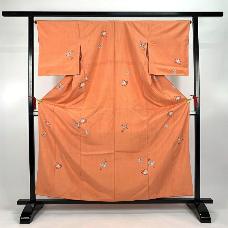 (中古)小紋 サーモンピンク カジュアル 紬地 花喰い鳥 花 袷 S【身丈】156.5cm【裄丈】65.5cm