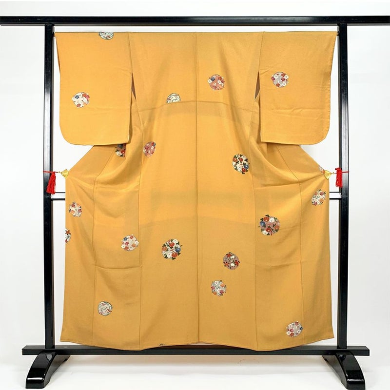 (中古)小紋 黄 カジュアル ちりめん 花丸 四季花 袷 SS【身丈】152.5cm【裄丈】68cm