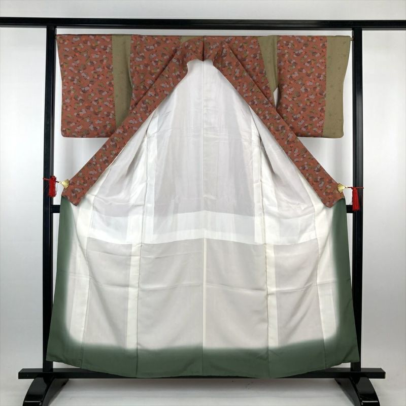(中古)小紋 薄茶 ポリエステル 洗える ちりめん調 糸巻 桜 袷 S【身丈】157cm 【裄丈】68cm