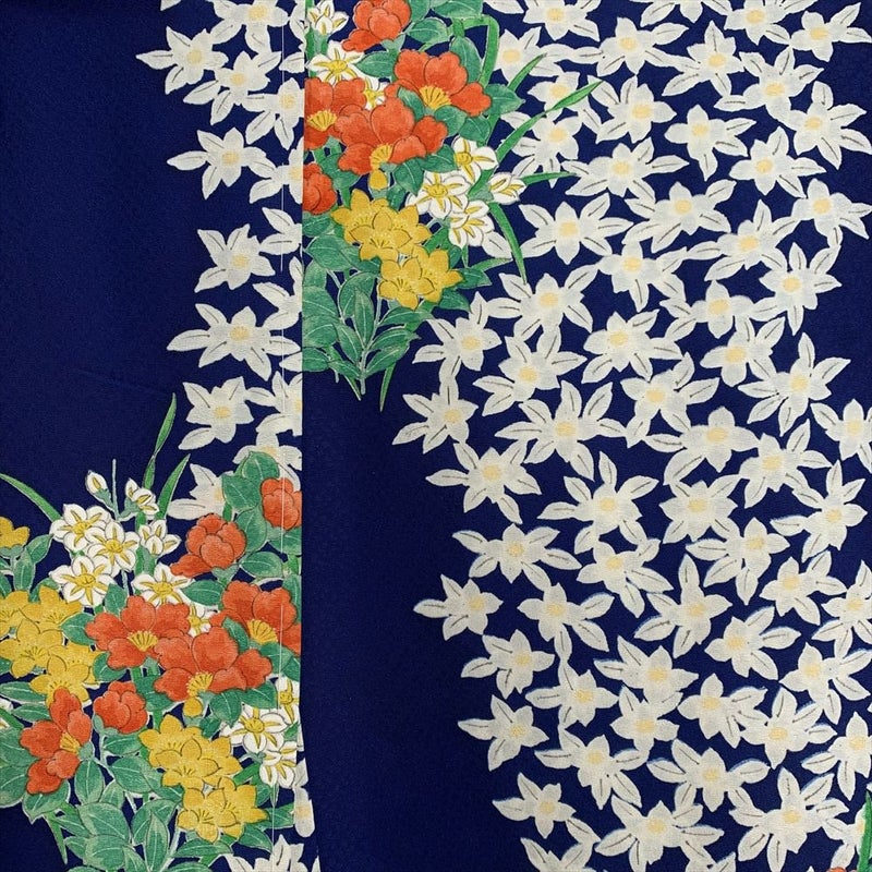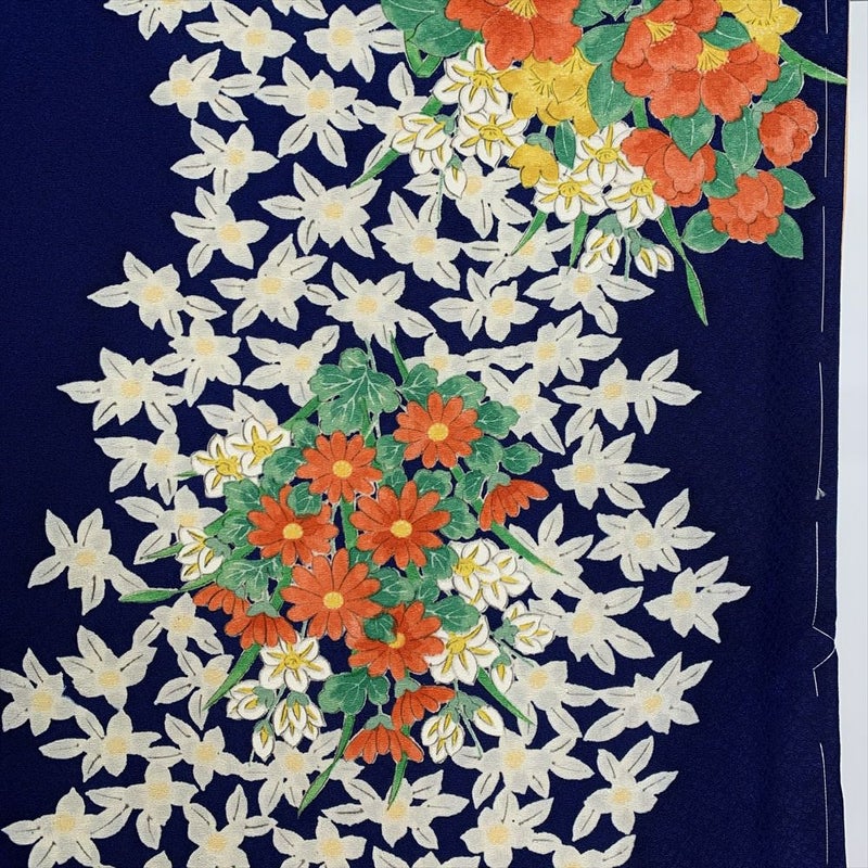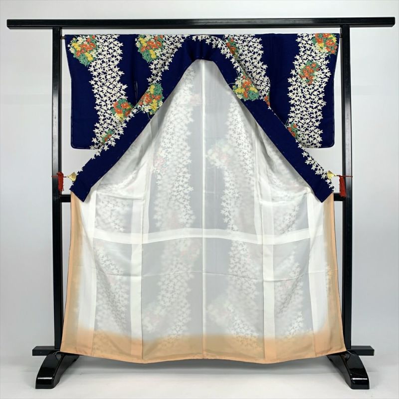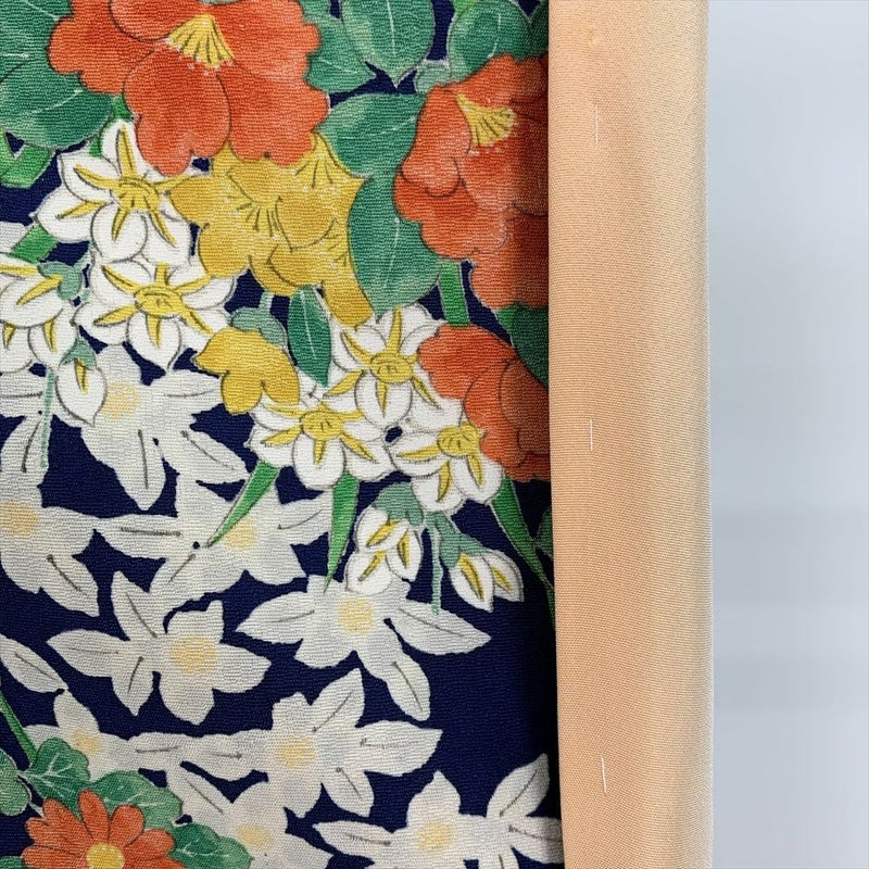 (中古)小紋 紺 カジュアル 地紋織り 花 袷【身丈】159.5cm【裄丈】67.5cm