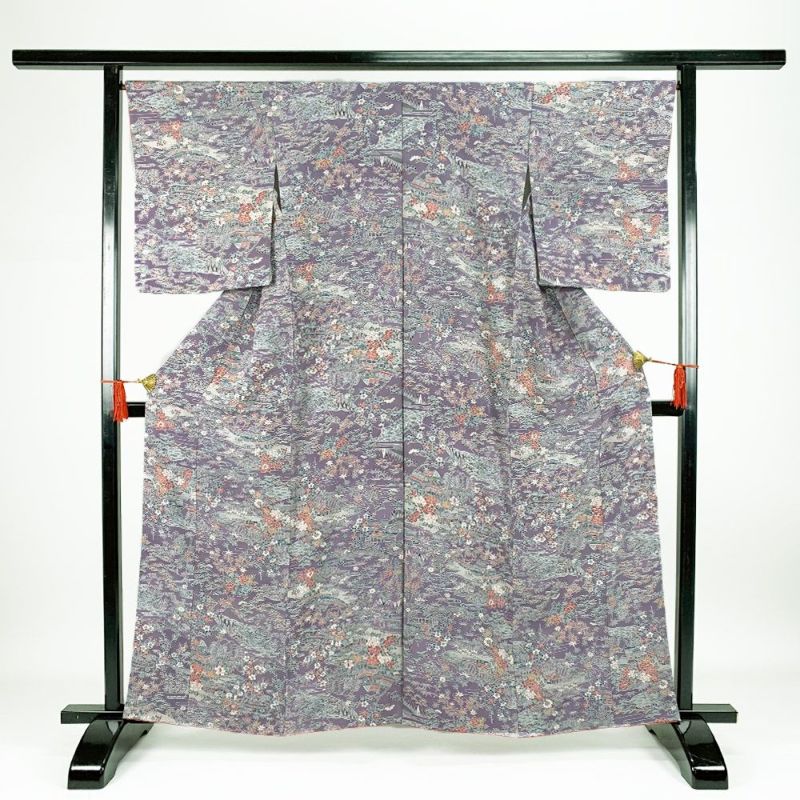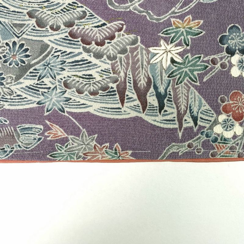 (中古)小紋 紫地 加賀友禅 四季花 松竹梅 青海波 茶屋辻 流水 袷【身丈】159.5cm【裄丈】69.5cm