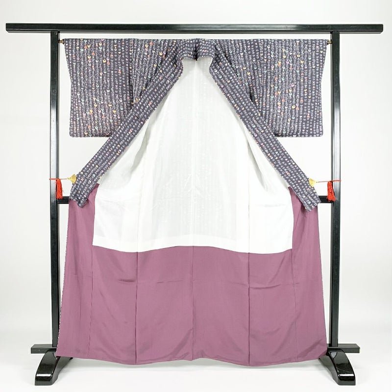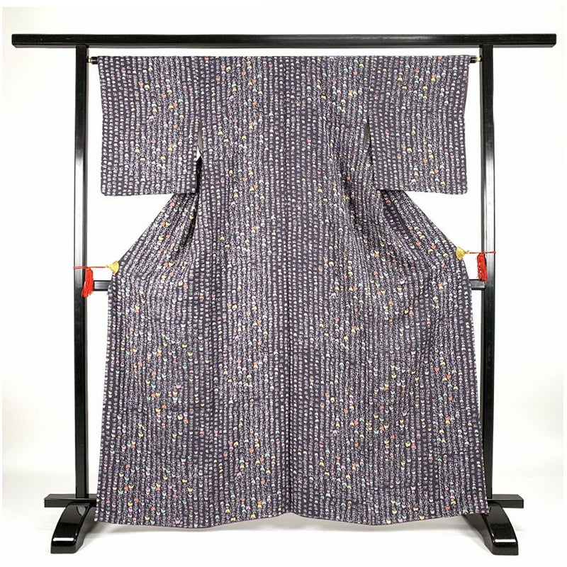 (中古)小紋 濃紫地 総柄 蝶 京友禅 袷【身丈】159.5cm【裄丈】66.5cm