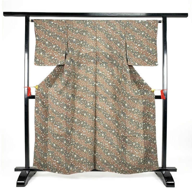 (中古)小紋 緑地 草花 総柄 ちりめん 道長取り 唐花 袷 S【身丈】156.5cm【裄丈】66.5cm