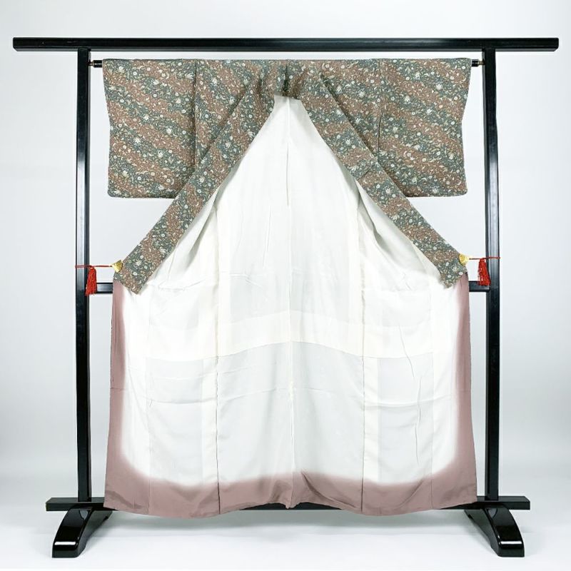 この小紋に描かれているのは、繊細な唐花模様。斜めに配置された意匠は、着る人の動きに合わせて優雅な表情を見せ、見る人を惹きつけます。