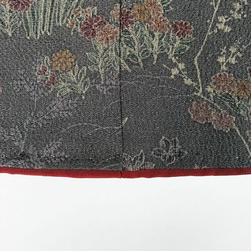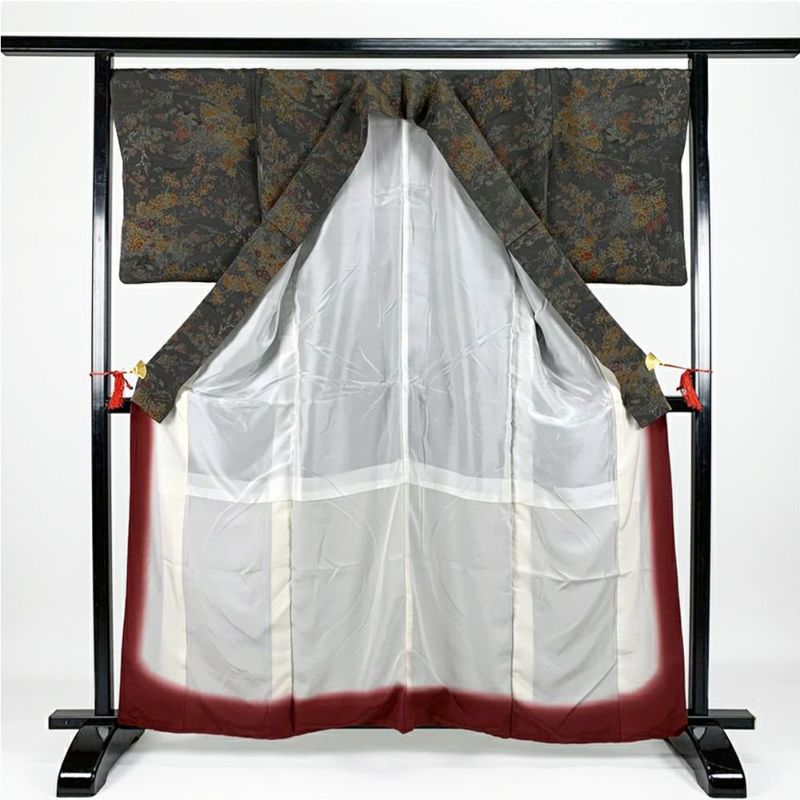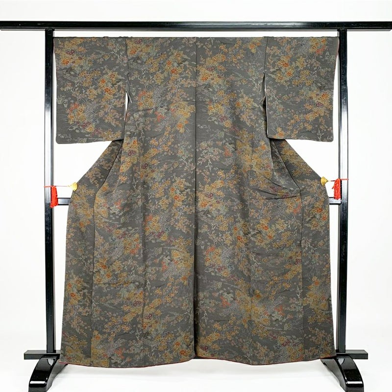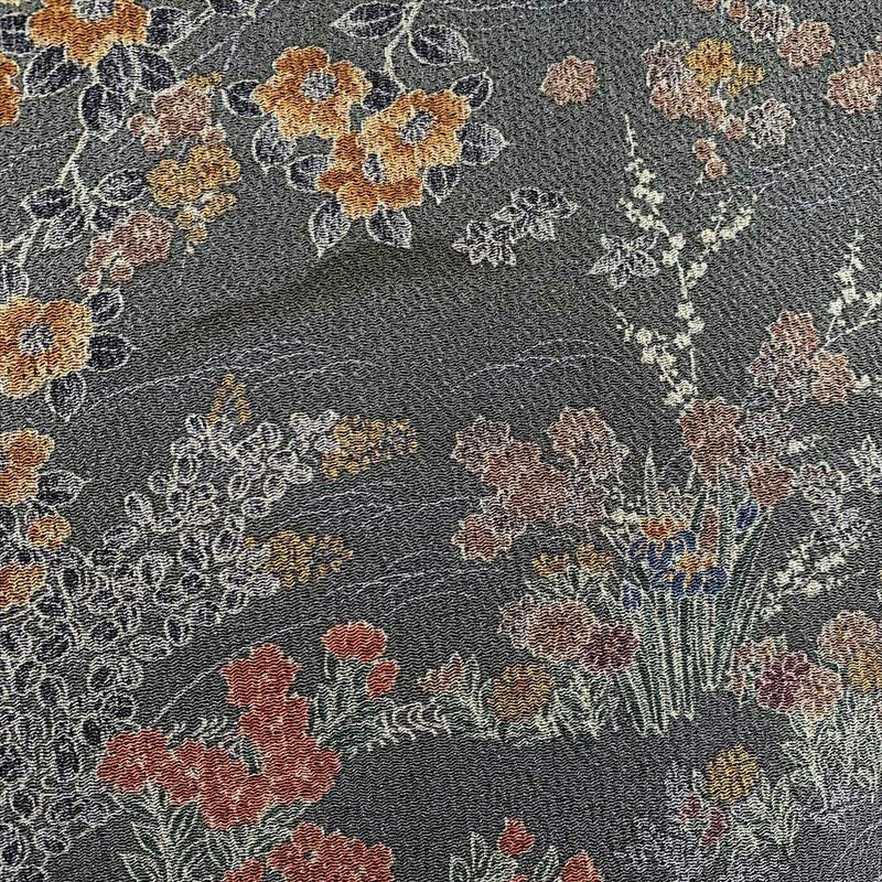 深みのある緑に四季花などが金彩を用いてデザインされた総柄小紋です。お稽古やお出かけなどお洒落着としてカジュアルなシーンでお召しいただけます。